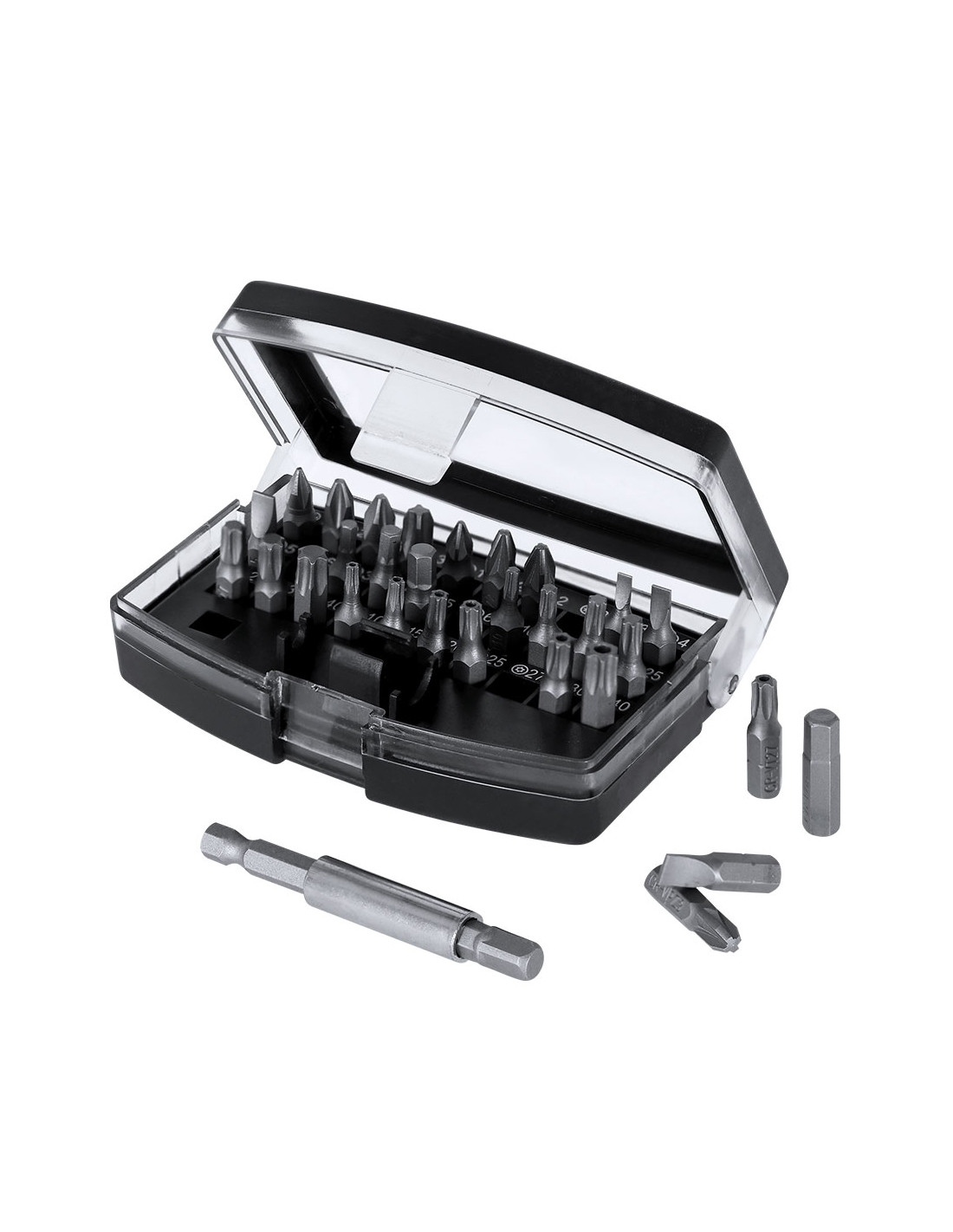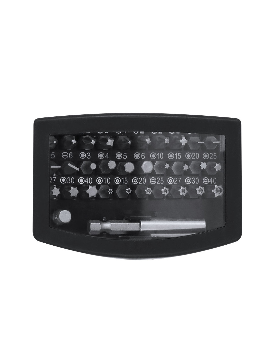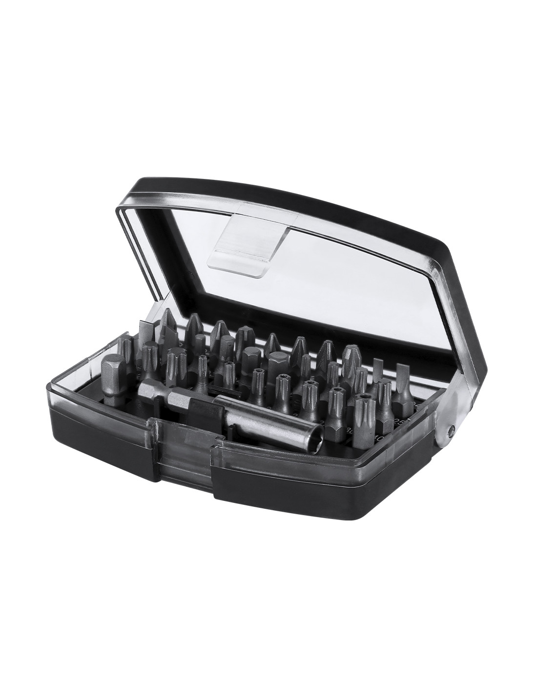 Práctico set de herramientas con estuche fabricado en ABS. Incluye un adaptador de precisión con 32 accesorios magnéticos, compuesto por diversas puntas: philips, estrella, planas, hexagonales y torx.