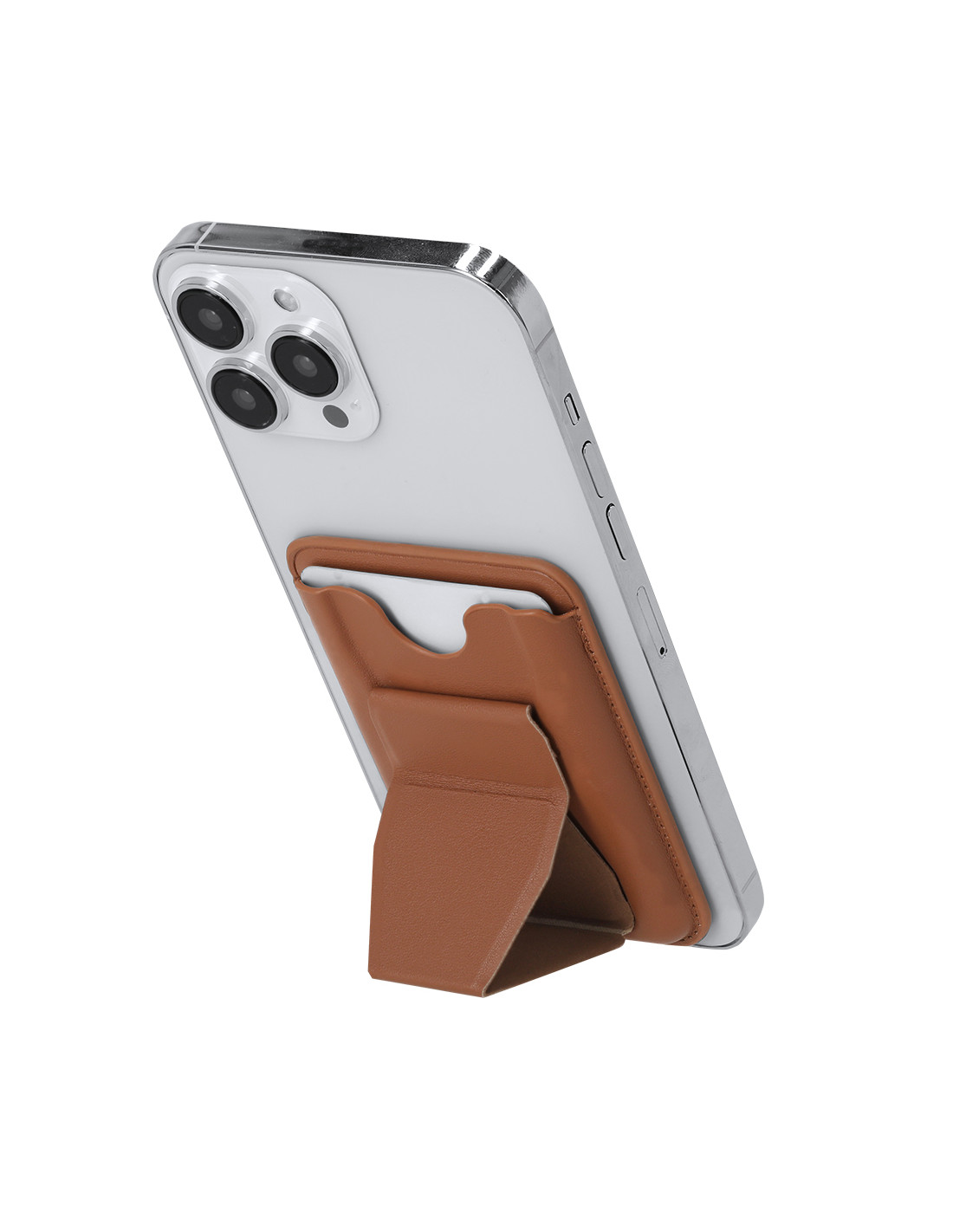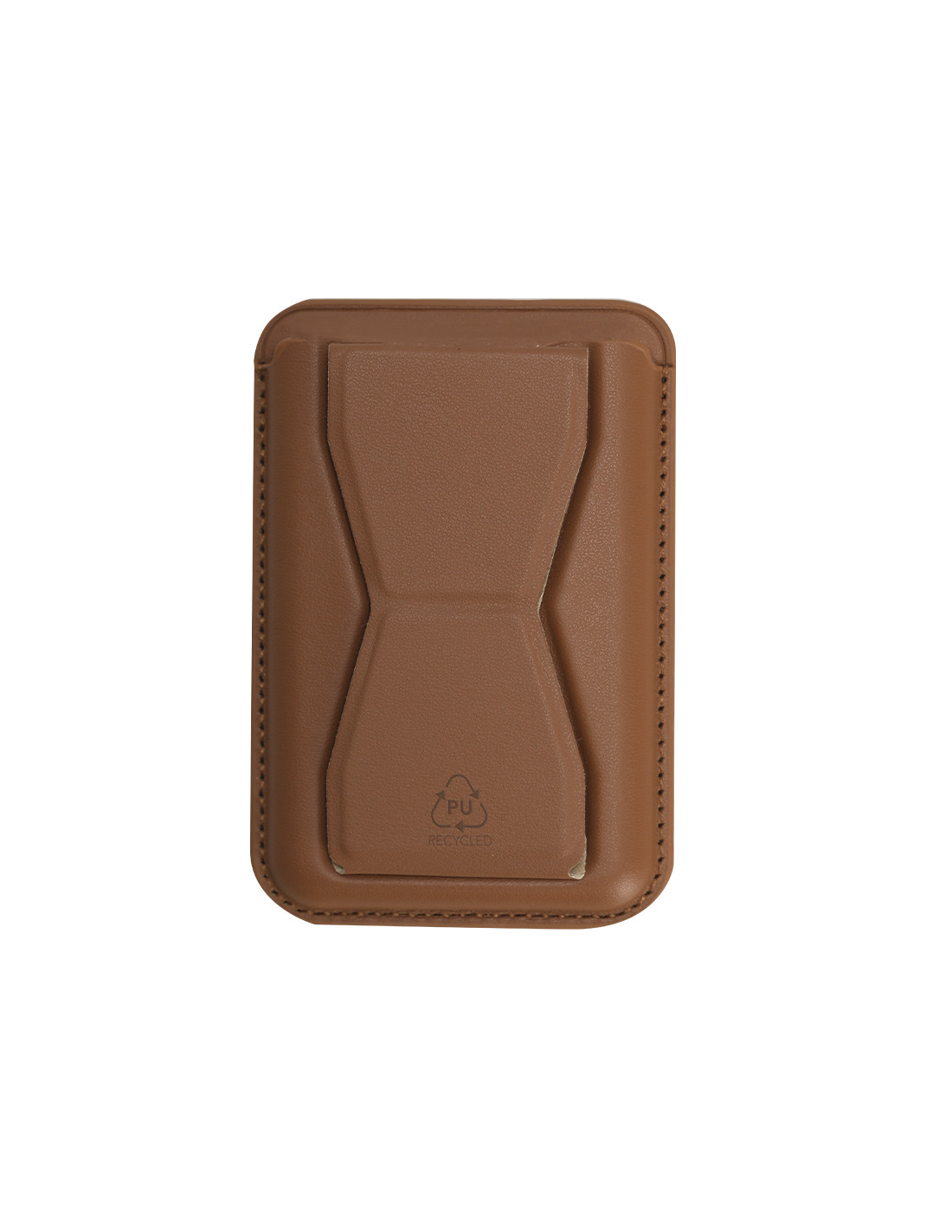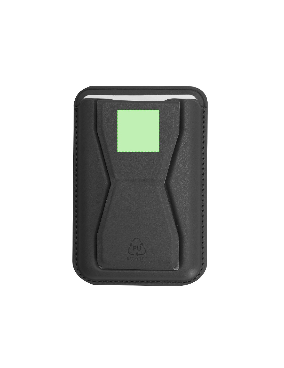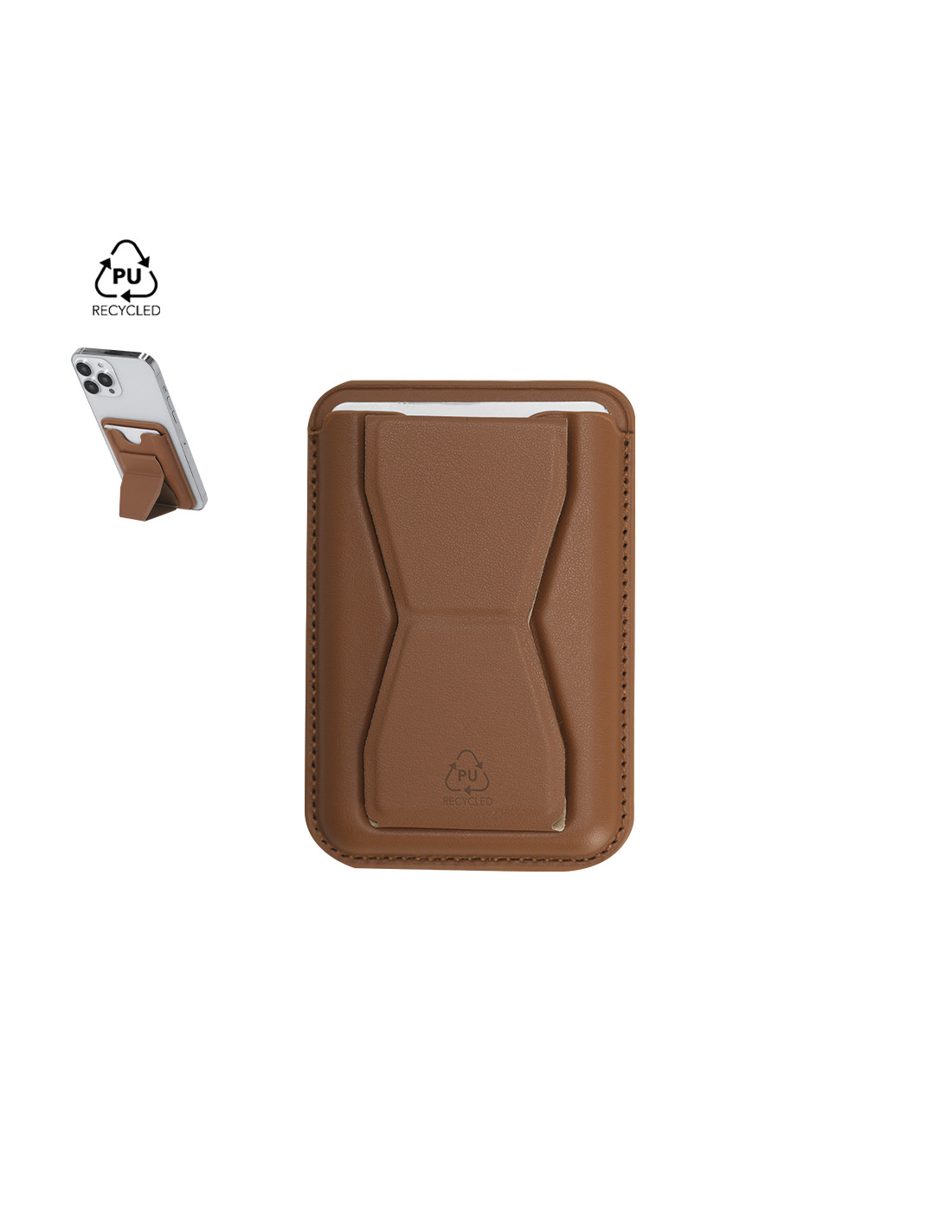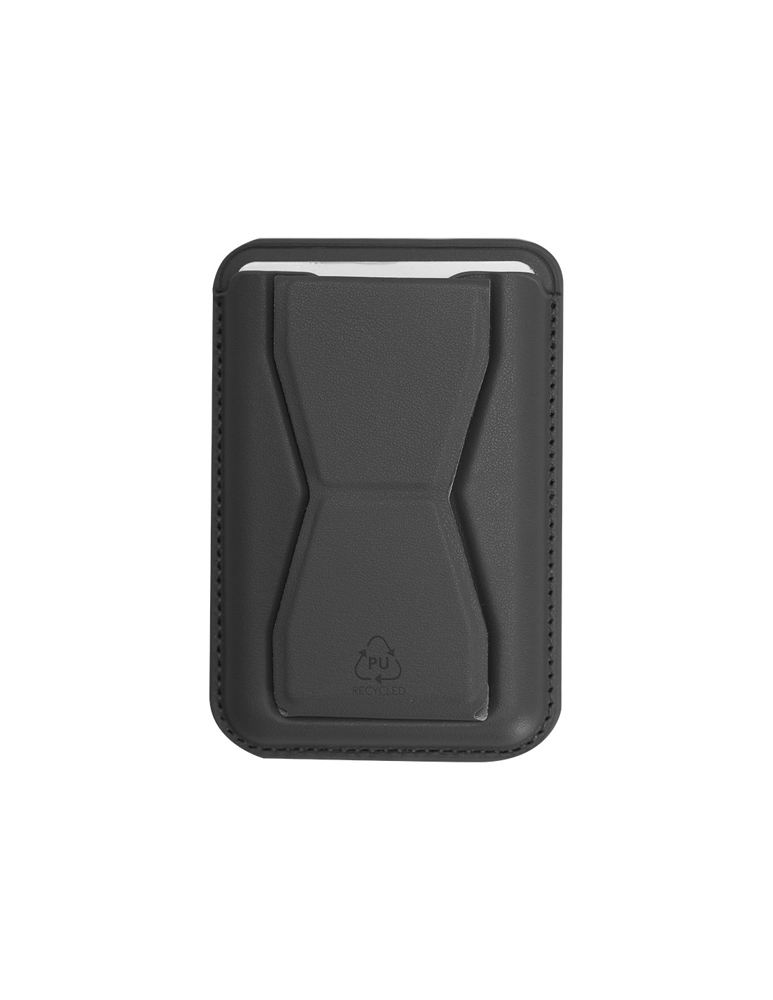 Tarjetero soporte en elegante PU reciclado. Con soporte multifuncional que permite diversas posiciones. Con sistema de fijación magnético. Incluye distintivo PU reciclado.