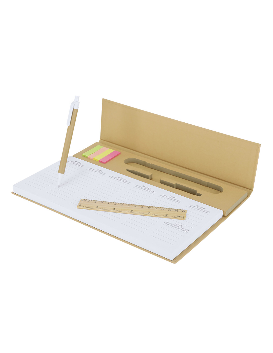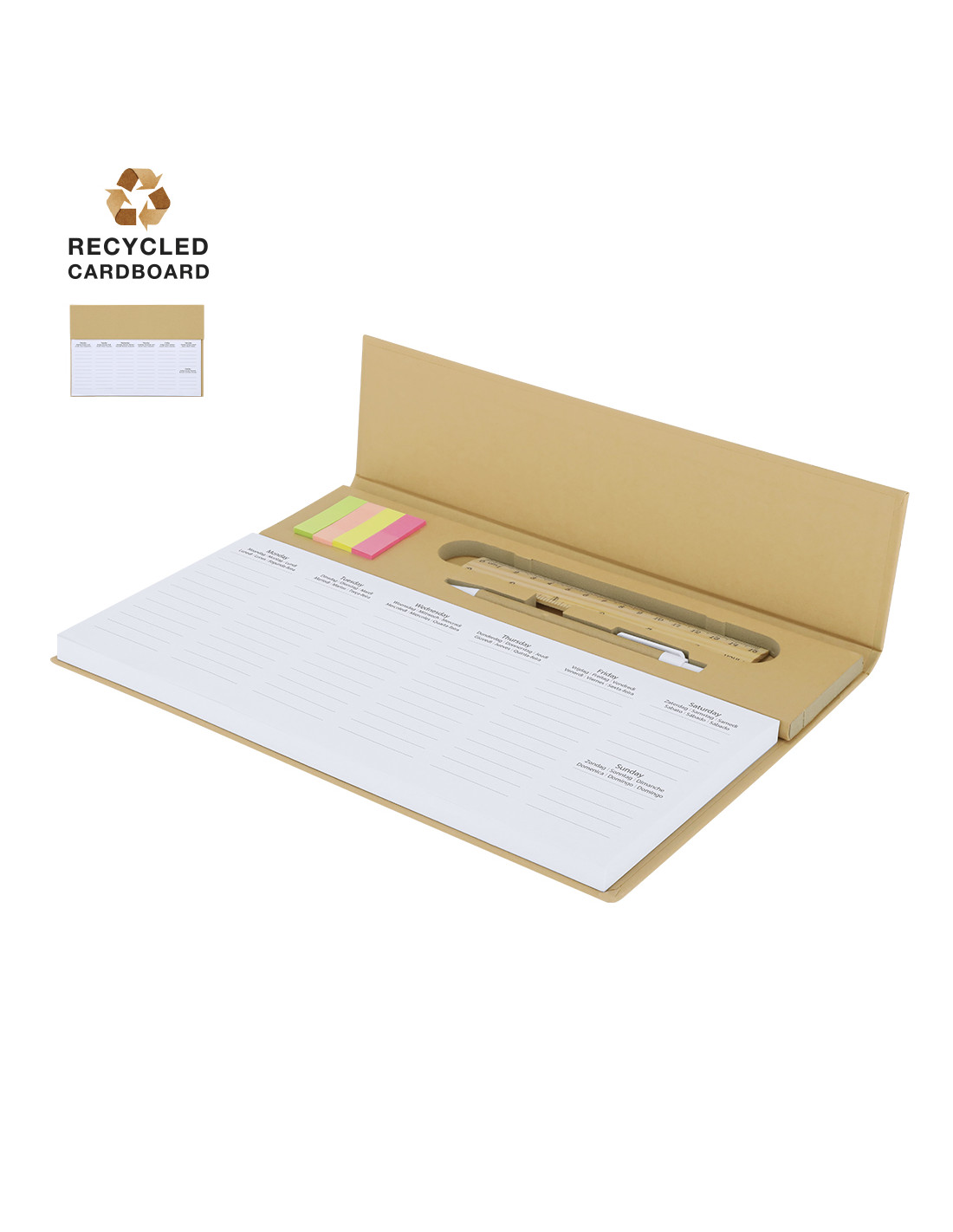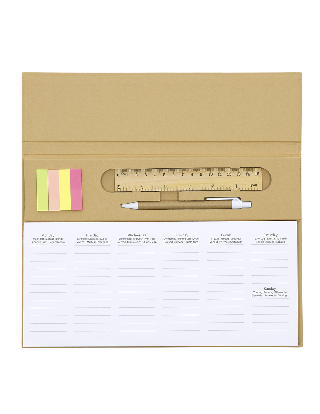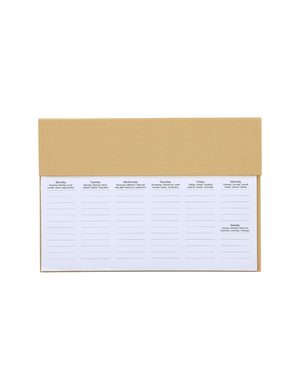 **Composición y materiales:** Planificador semanal de mesa. Disponible en 7 idiomas (español, inglés, francés, portugués, alemán, neerlandés, italiano).