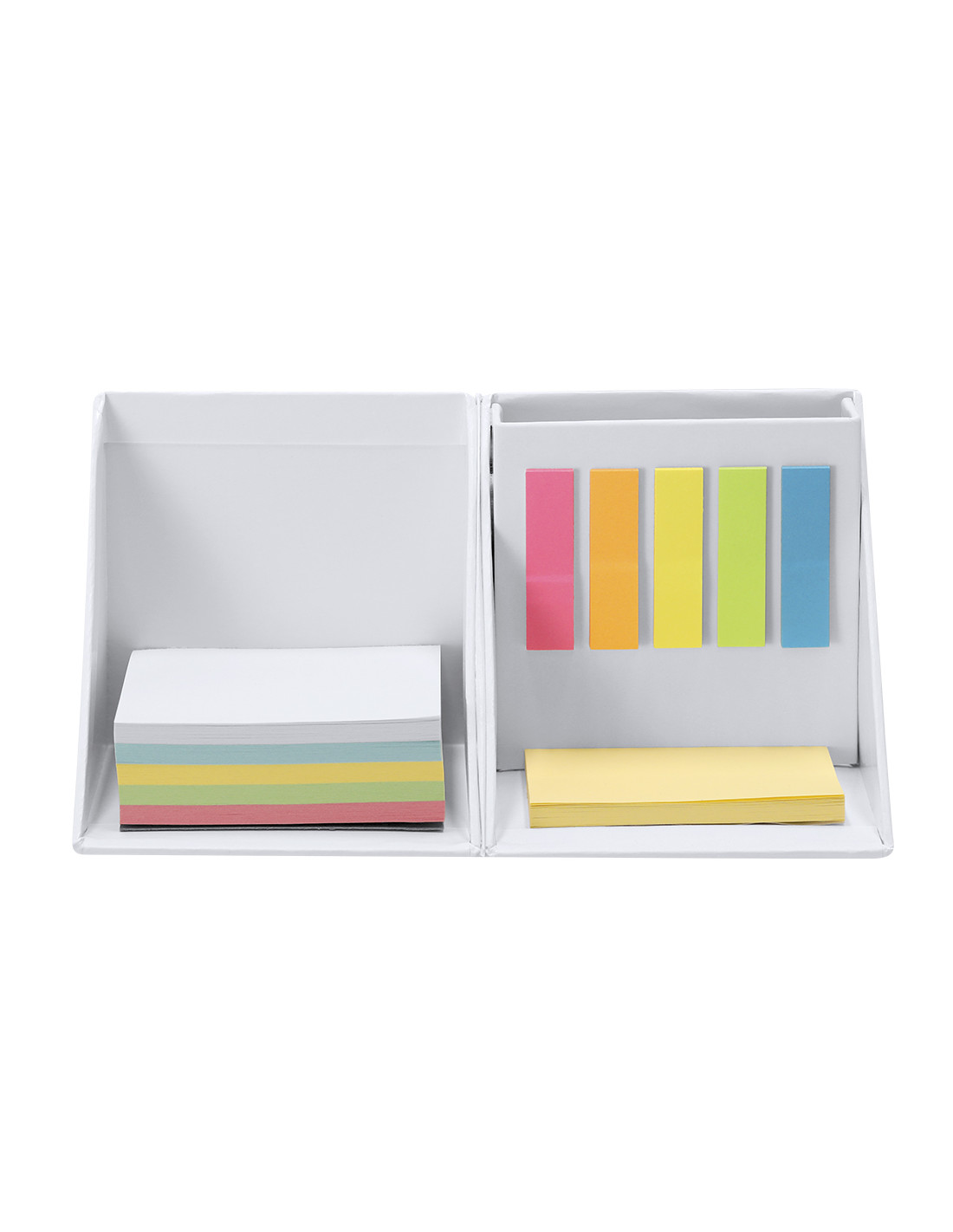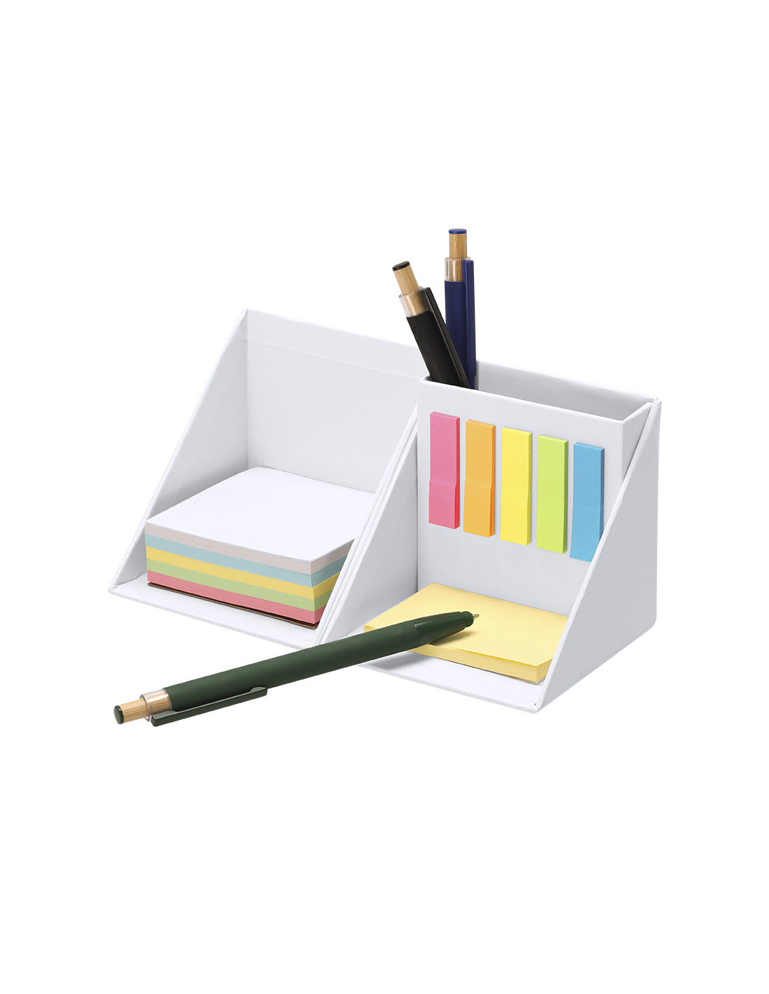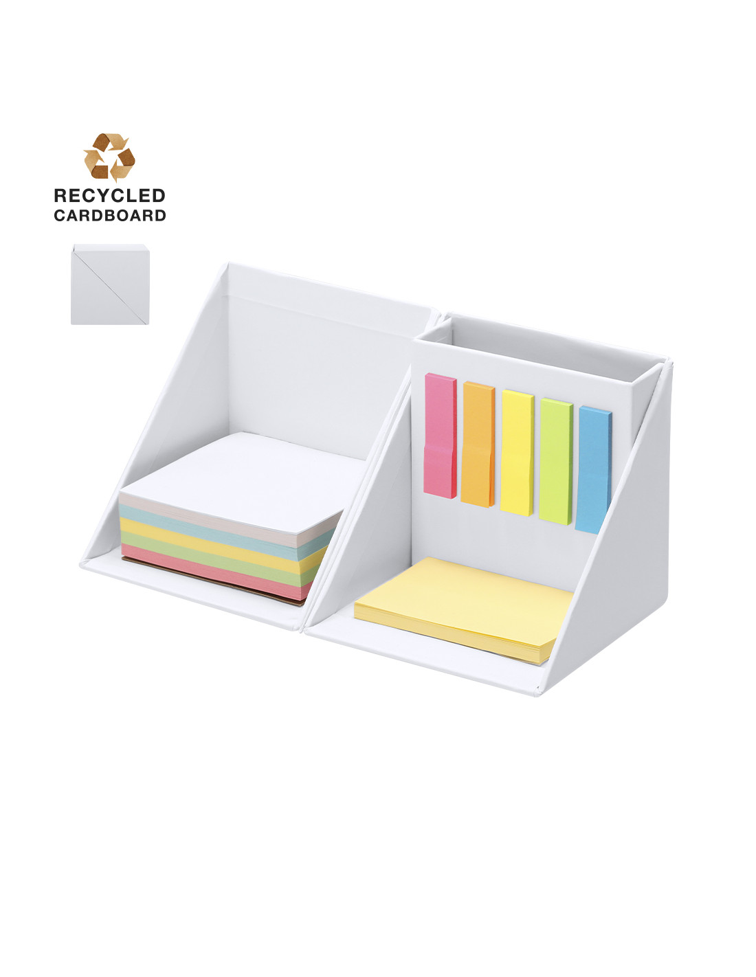 Original portalápices con portanotas plegable en forma de cubo fabricado en cartón reciclado. Desplegado presenta función de escritorio portátil en el que ofrece un espacio para almacenar bolígrafos. Incluye 125 mininotas adhesivas de diferentes colores (amarillo, rosa, azul, verde y naranja). 50 notas adhesivas amarillas y 250 hojas de colores (50 por color: blanco, azul, amarillo, verde y rosa). Ideal para transportar y tener en tu lugar de trabajo gracias a su tamaño compacto y a su amplia funcionalidad.