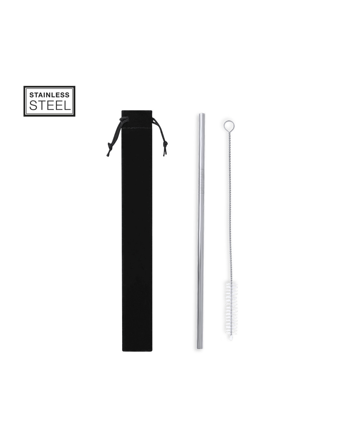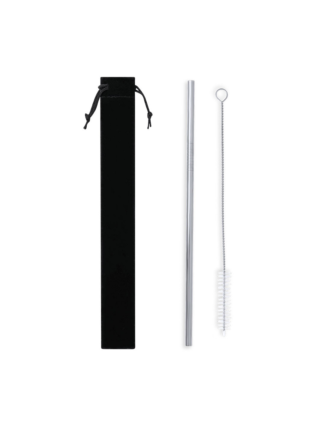 Juego de pajita reutilizable en acero inox. Con accesorio cepillo limpiador incluido y presentada en estuche de suave microfibra con cordones ajustables para mejor cierre.