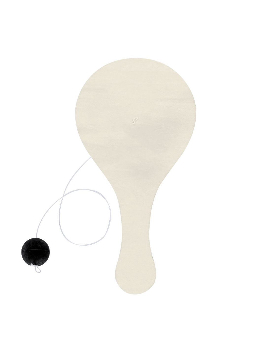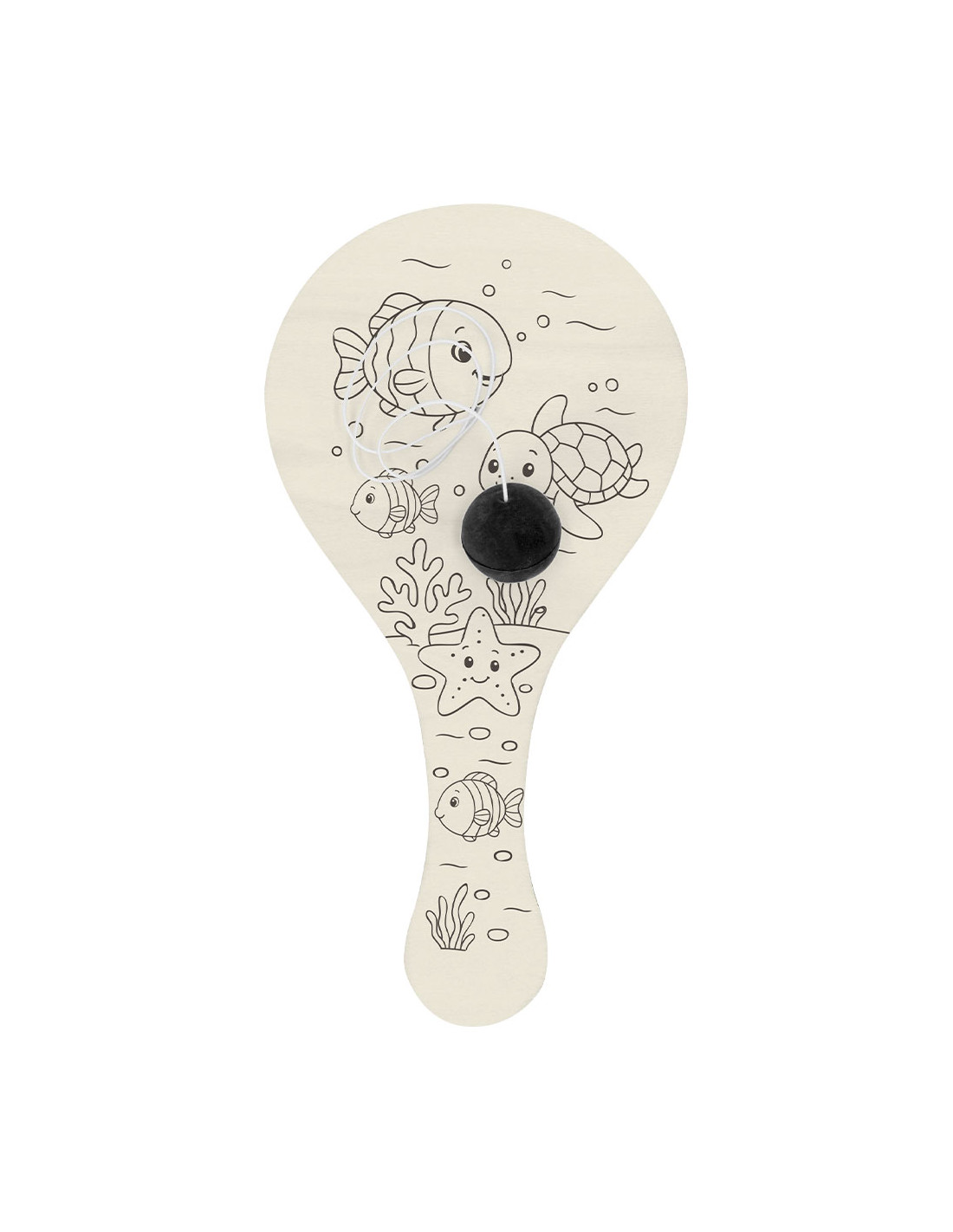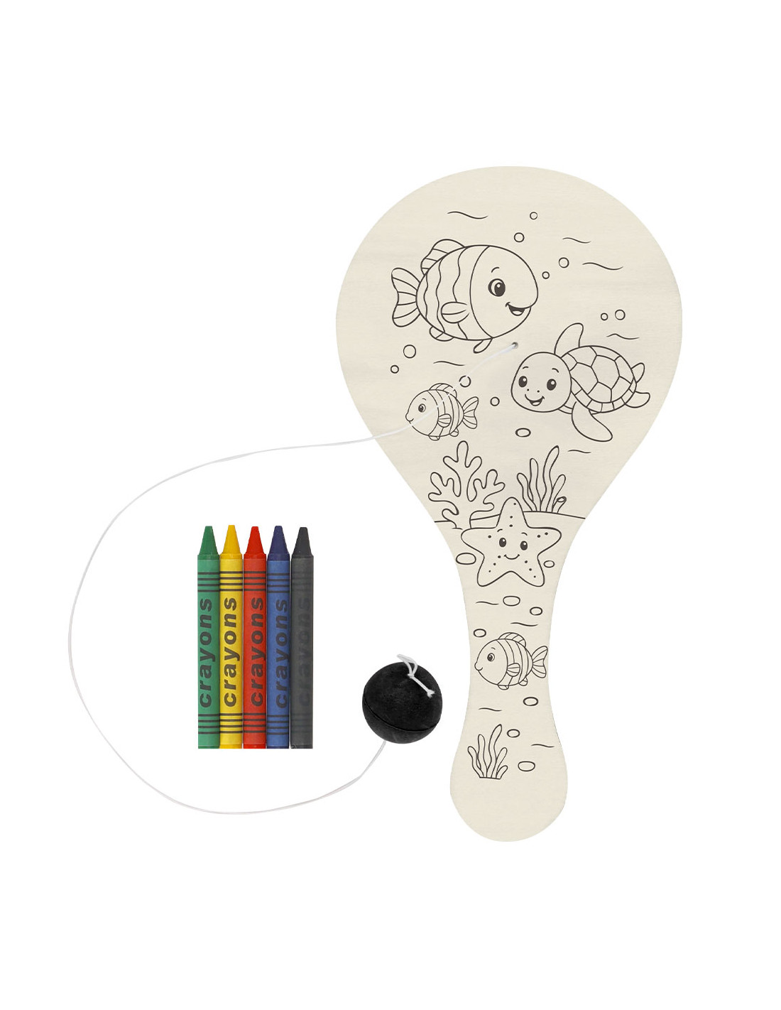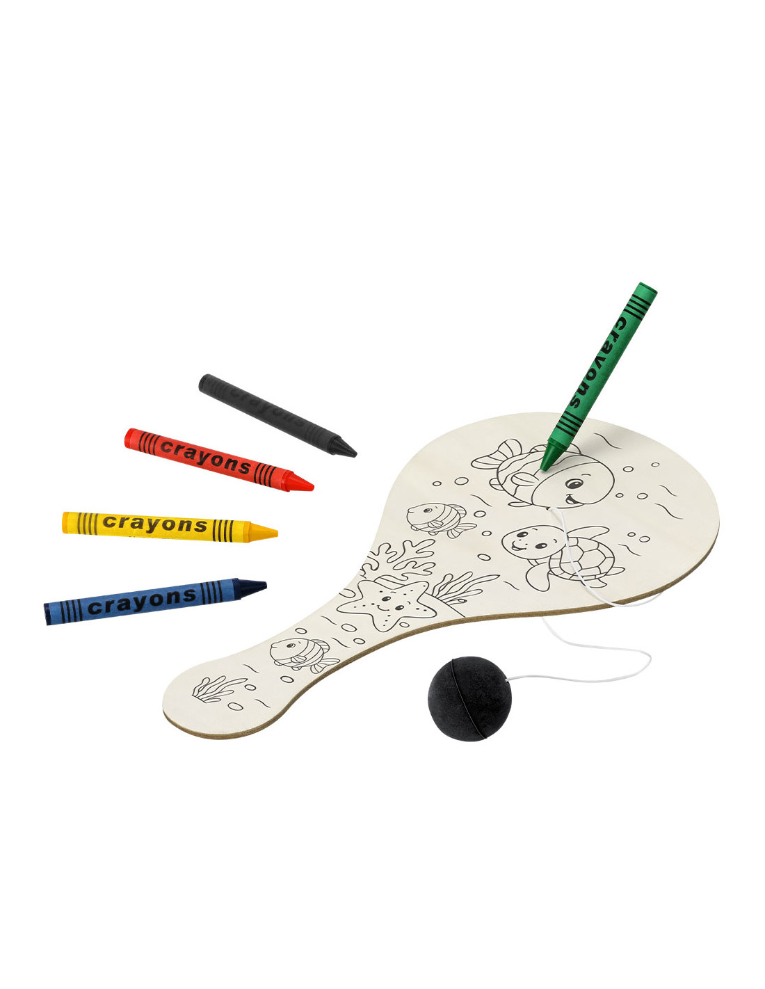 Set creativo de raqueta de madera con pelota, ideal para colorear y jugar.Incluye divertidos dibujos en el frontal para personalizar con las 5 ceras de colores incluidas. La pelota está unida a la raqueta mediante un cordón elástico, perfecto para disfrutar del juego mientras desarrollas la creatividad.