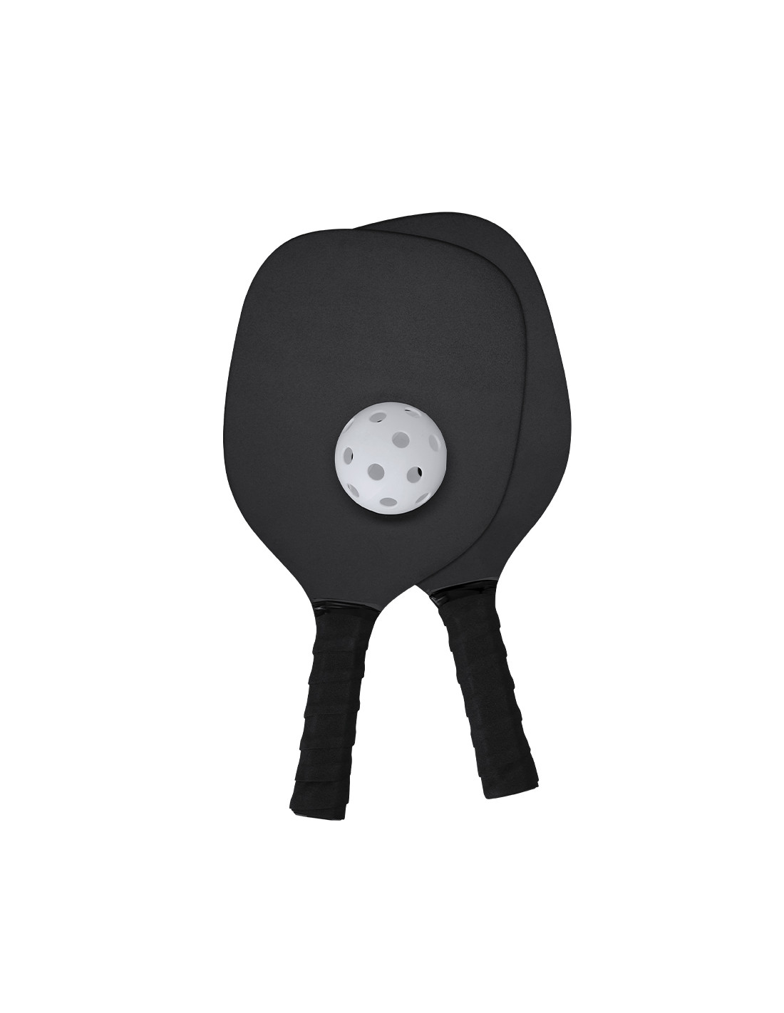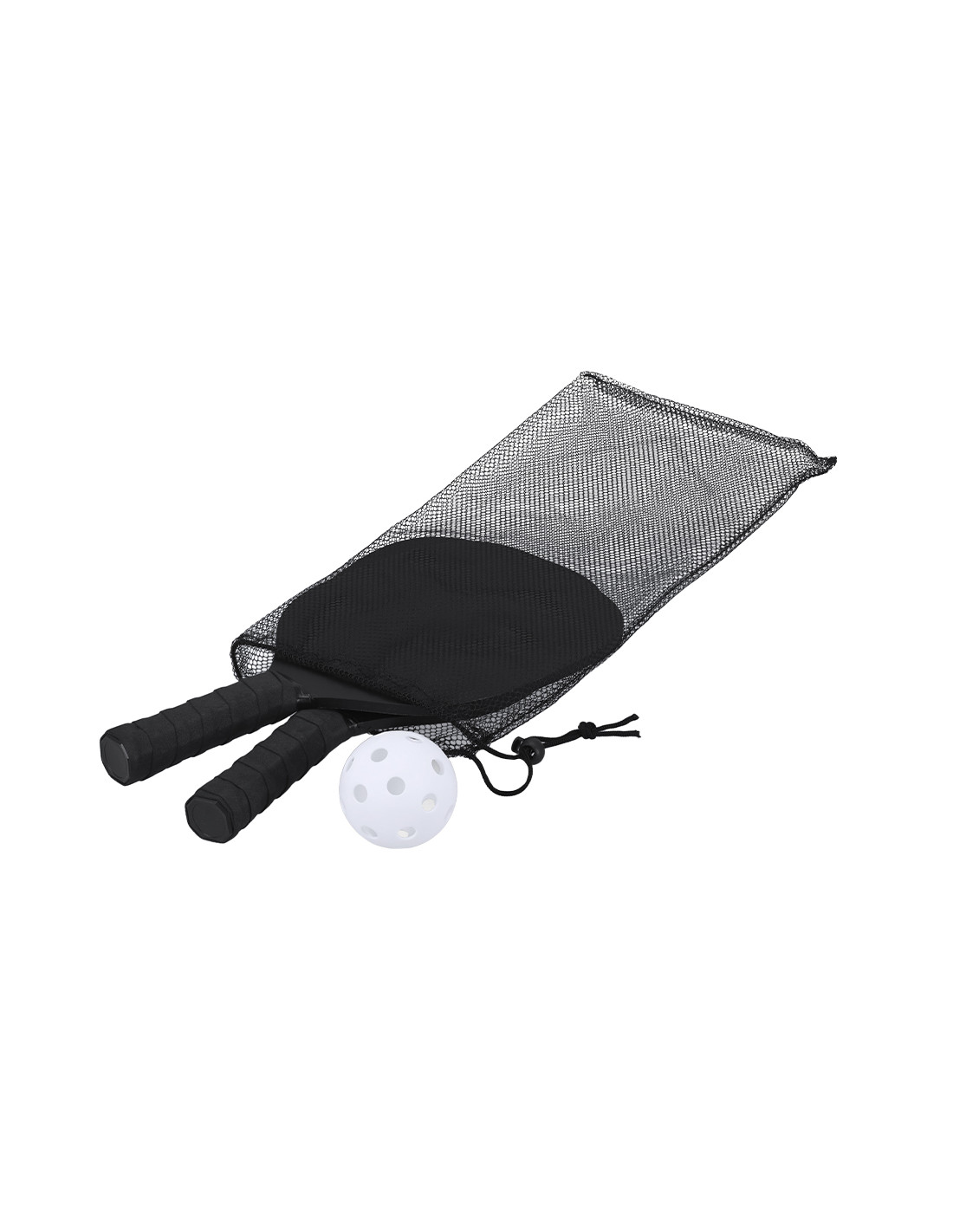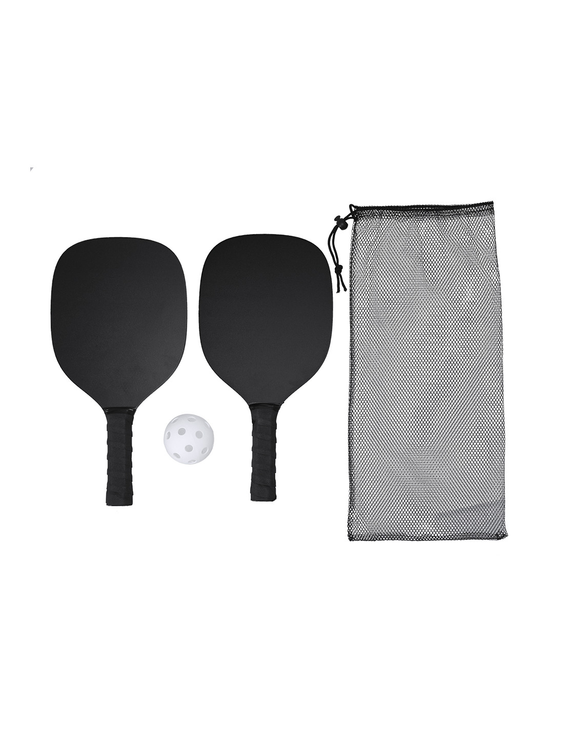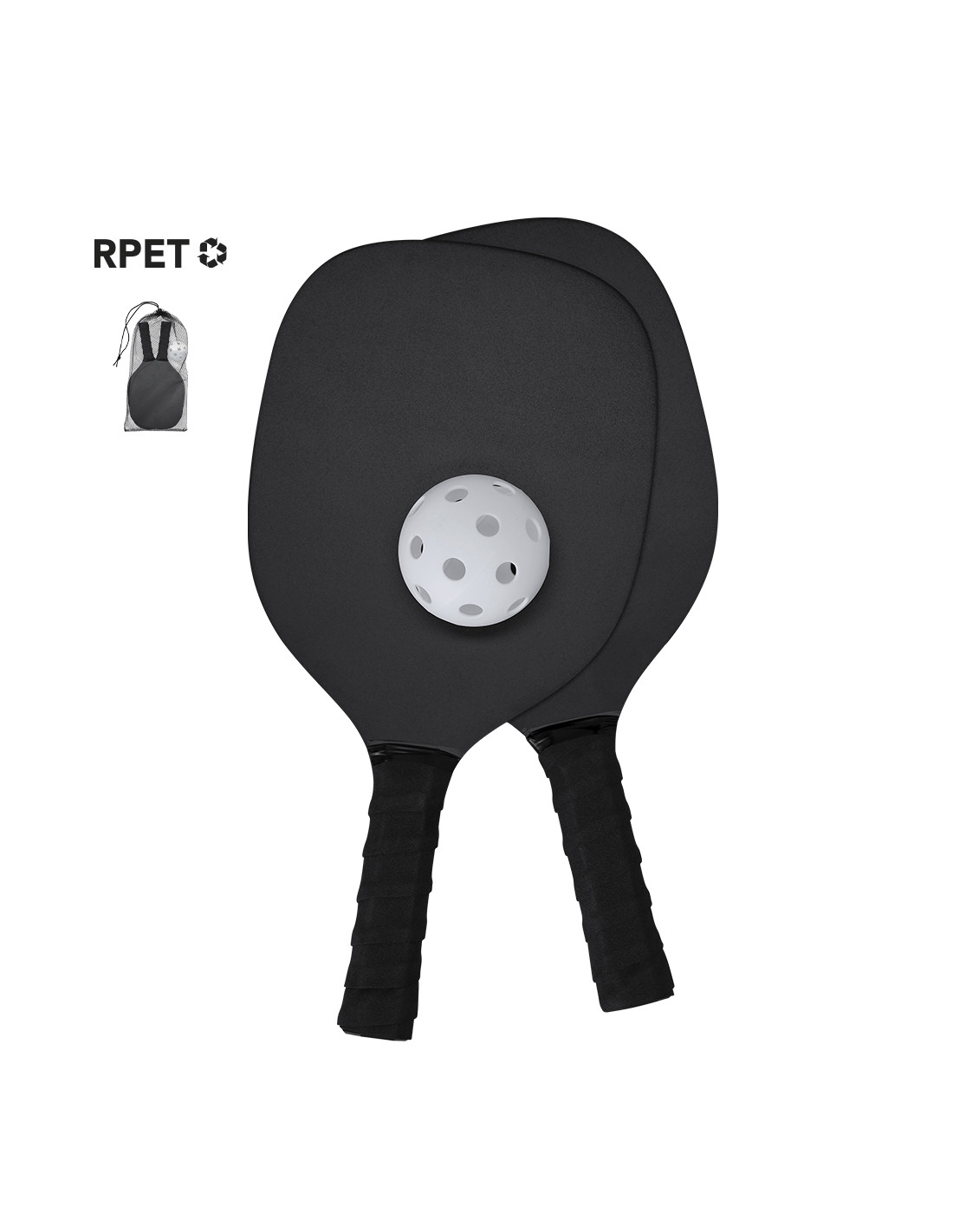 Par de palas de Pickle Ball de madera MDF en acabado mate con pelota. Mango recubierto en suave EVA en color negro para mejor agarre. Incluye bolsa de malla RPET para guardar y fácil de transportar.