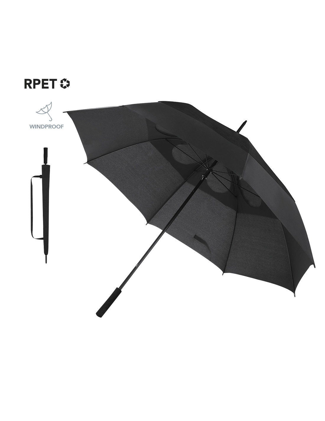 Paraguas de 130cm de diámetro, fabricado en material poliéster RPET 210T. Con apertura/ciere manual y varillas de fibra de vidrio. Mango en EVA . Se presenta en una funda en mismo color con correa para llevar comodamente. Incluye distintiva etiqueta RPET.