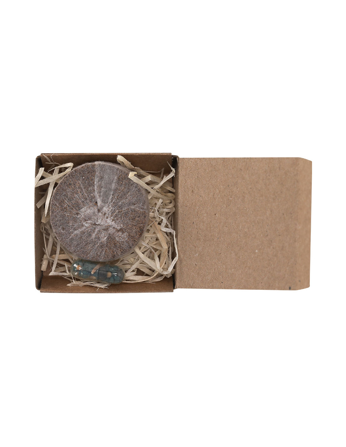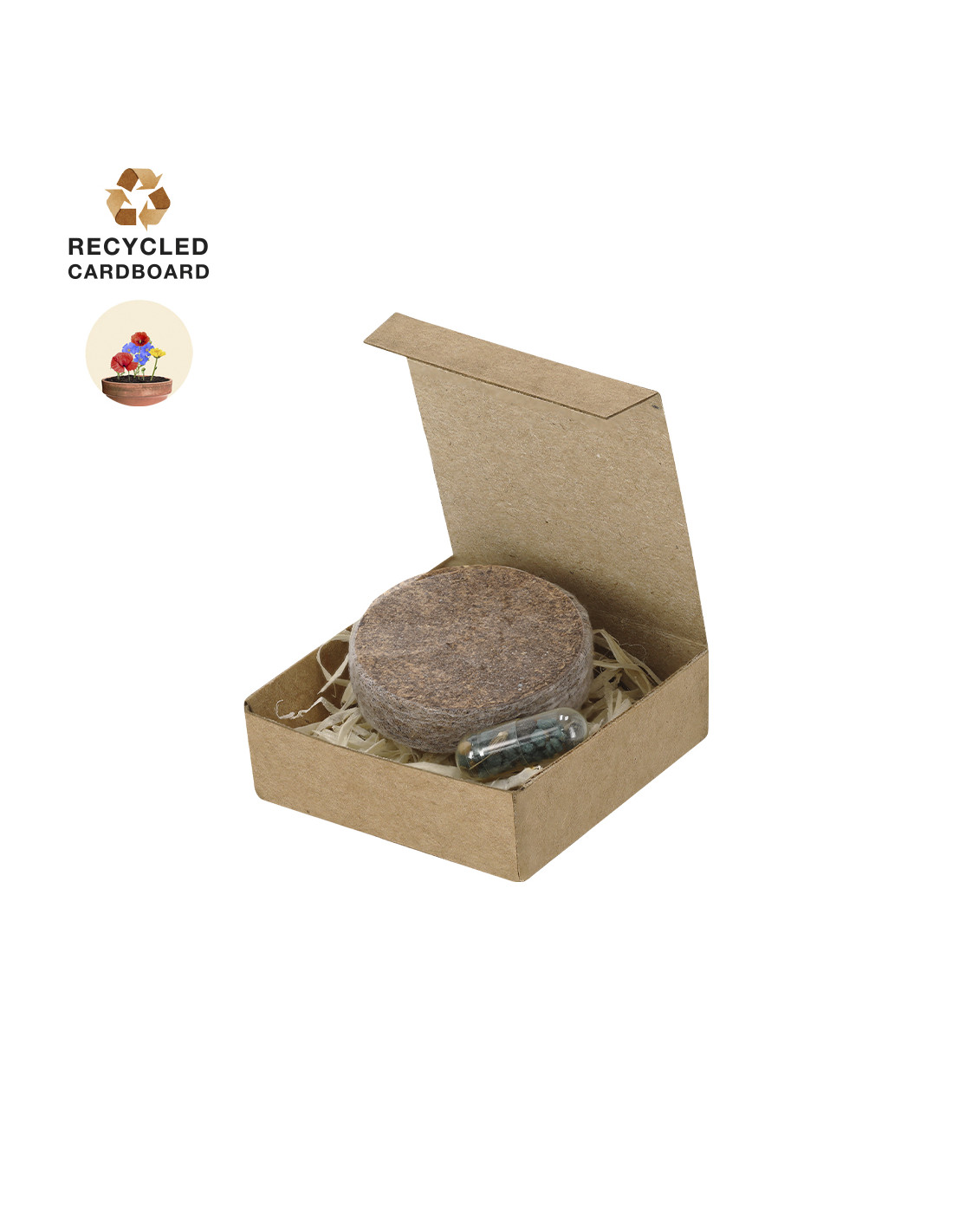 Pack plantable con cápsula de semillas y pastilla de sustrato, presentado en estuche de cartón reciclado con instrucciones de plantado. Flores silvestres.