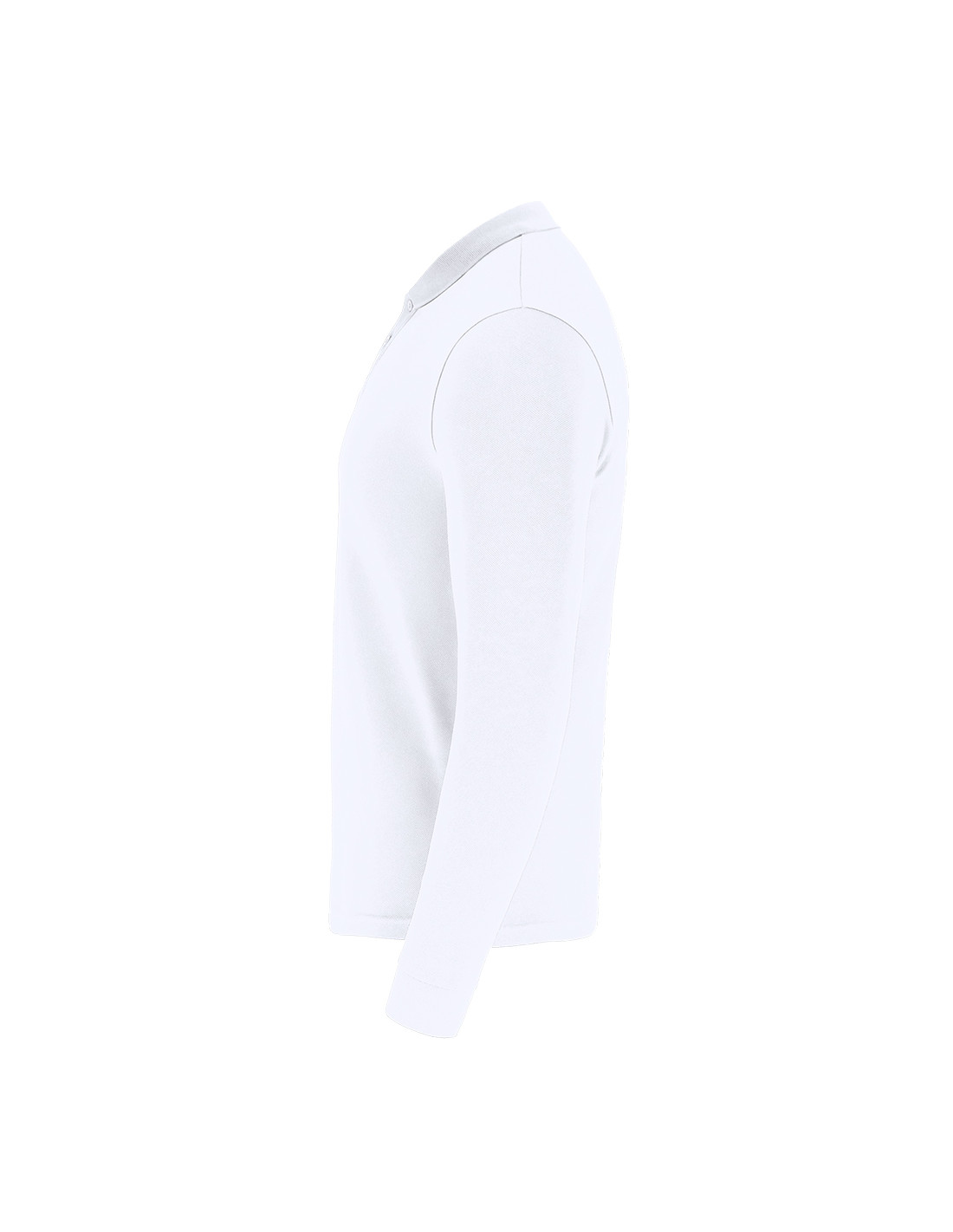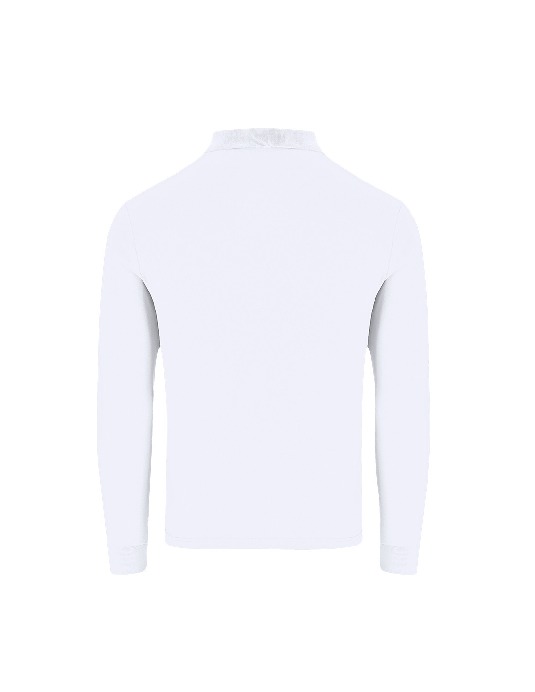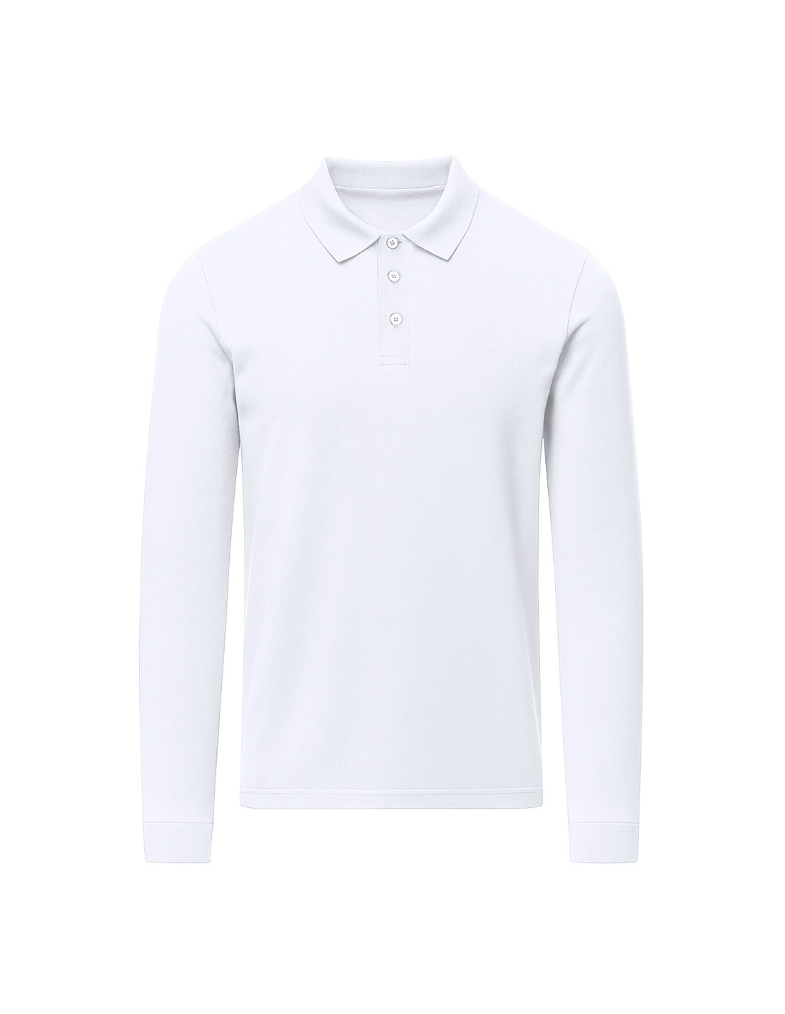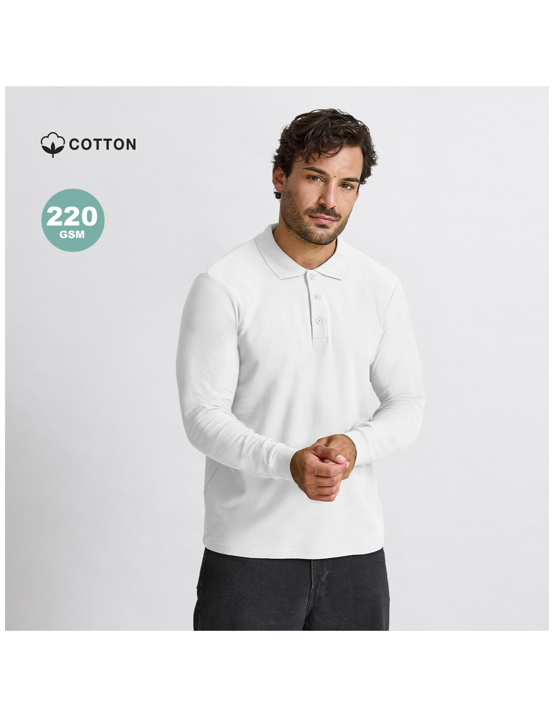 **Composición y materiales:** Polo unisex de manga larga confeccionado en tejido piqué. Cuello y puños en punto elástico 1x1 con elastano para un mejor ajuste y confort. Tapeta de tres botones a tono y cubrecosturas reforzado en cuello.