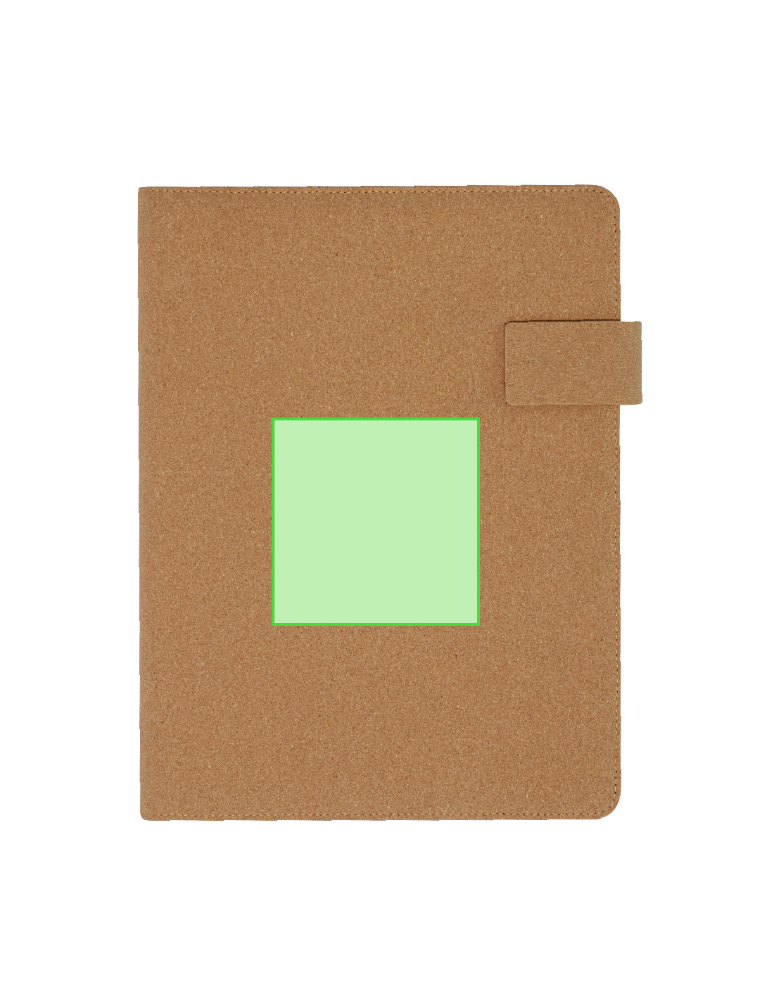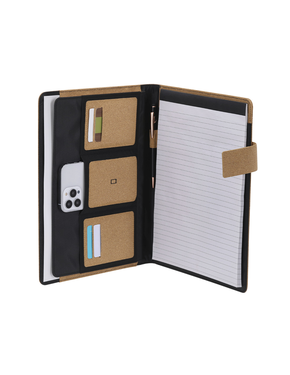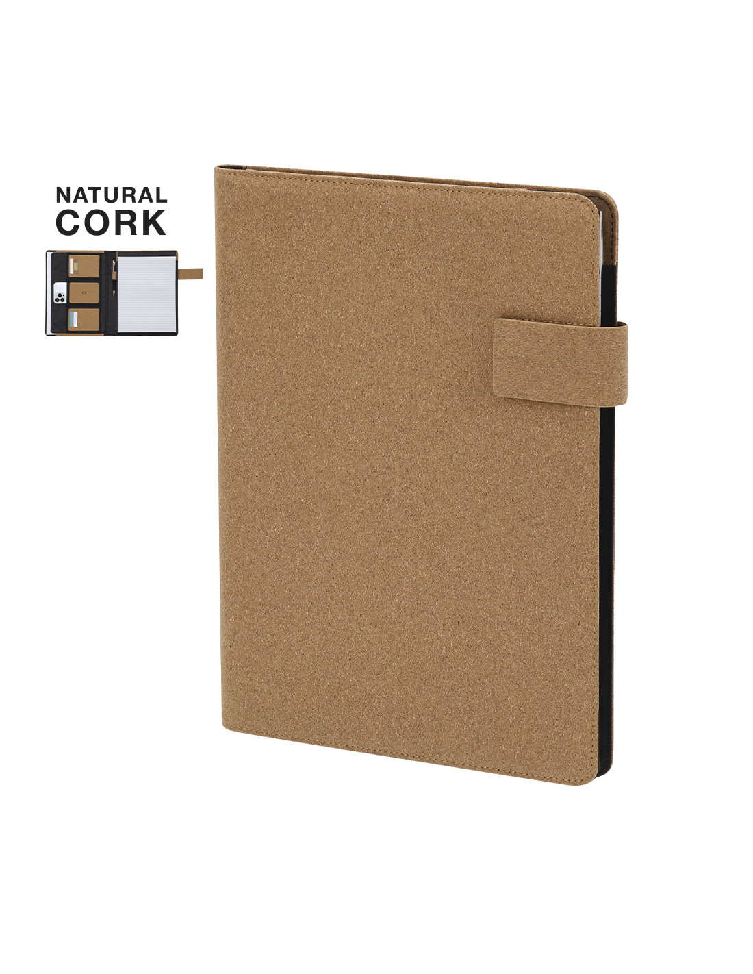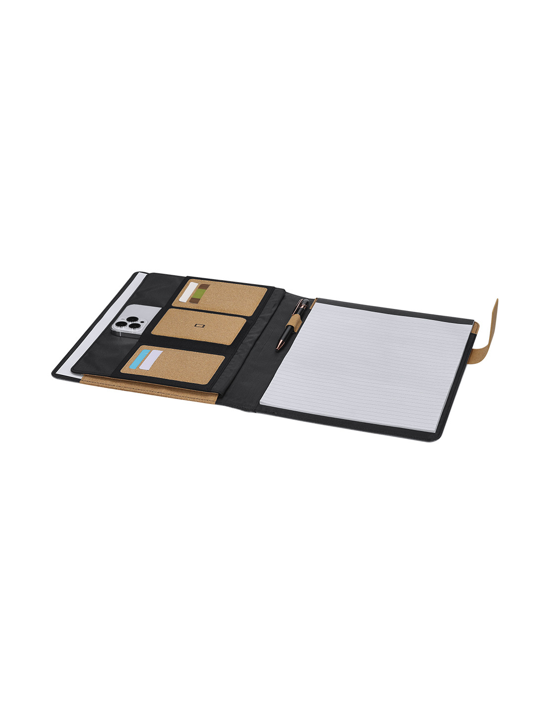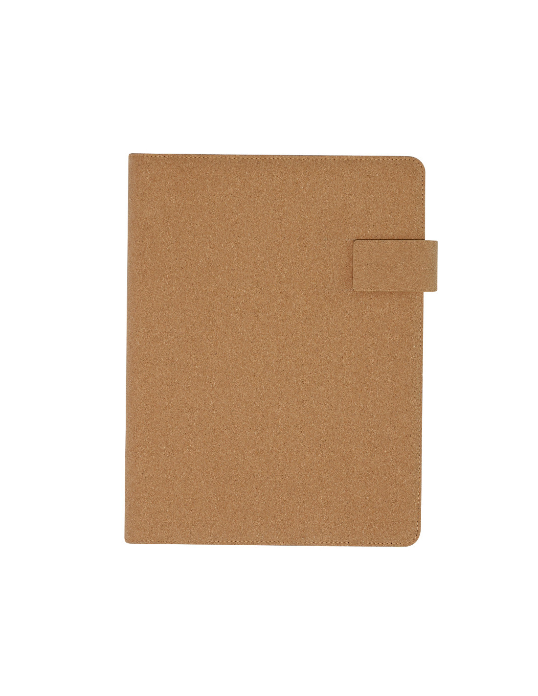Carpeta en tamaño A4 fabricada en corcho con cierre magnético. Ofrece múltiples funcionalidades. Bloc de notas con 20 hojas blancas a disposición en raya, sujetada a través de un bolsillo interior. Interior con 4 compartimentos; uno para guardar el smartphone, y otros dos para tener a mano tus esenciales. Además, incluye un bolsillo extensible y un porta bolígrafos. Elaborada con elementos vegetales para así fomentar la utilización de materias primas naturales y reducir las emisiones contaminantes.