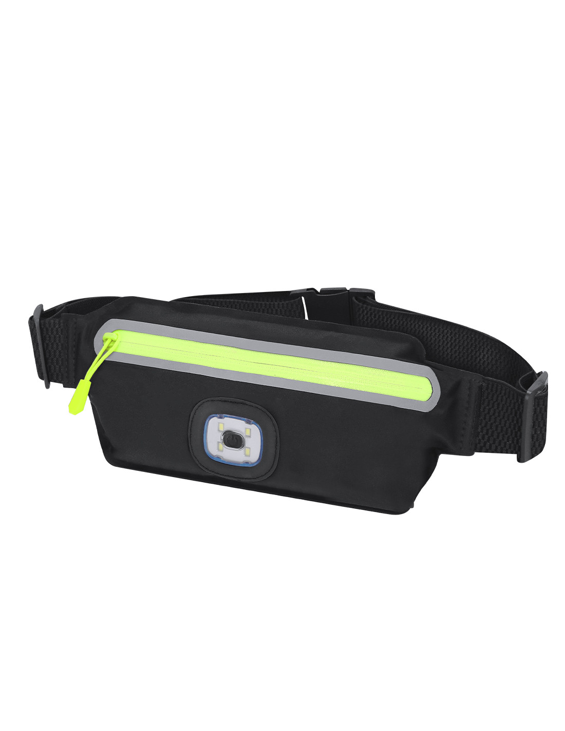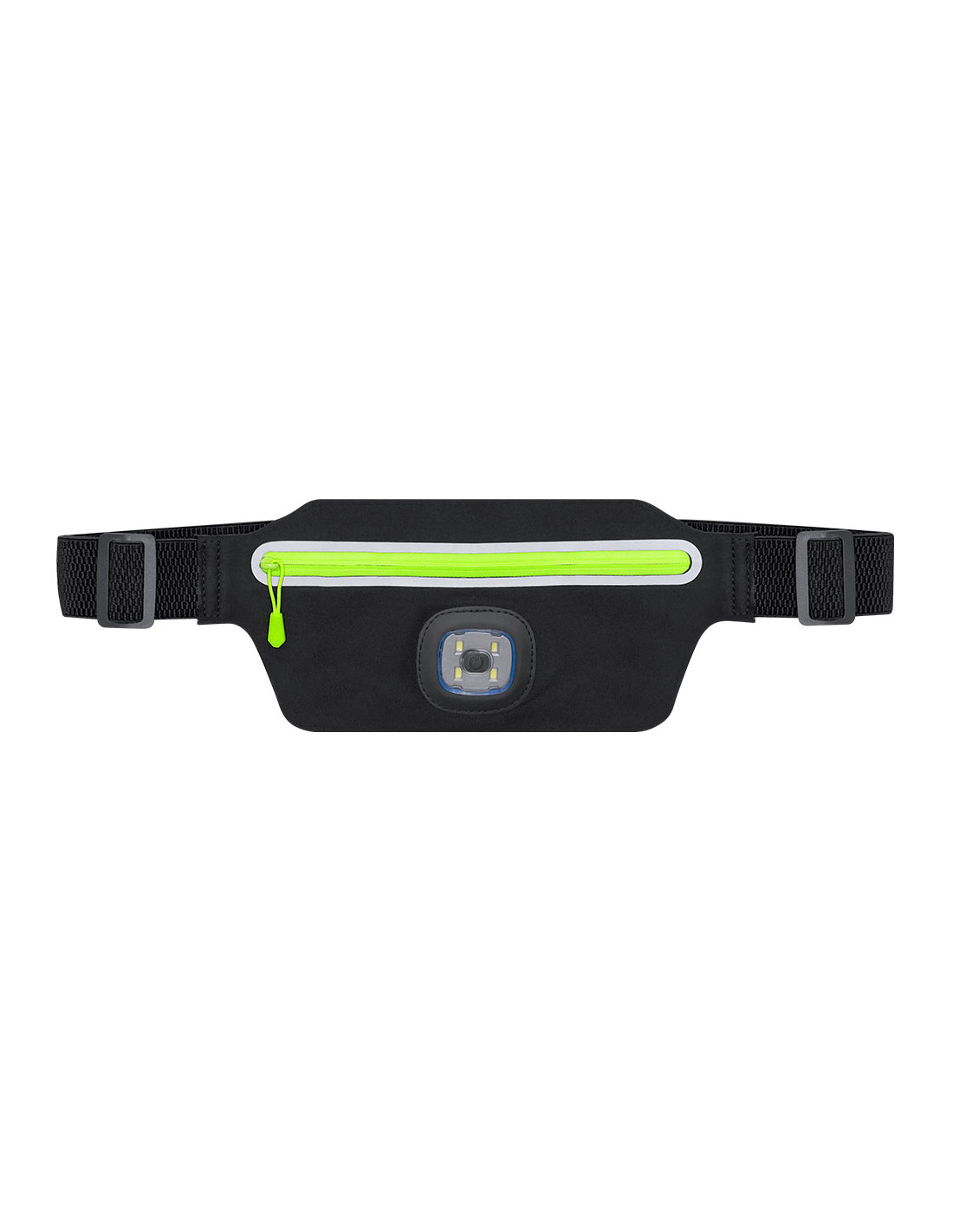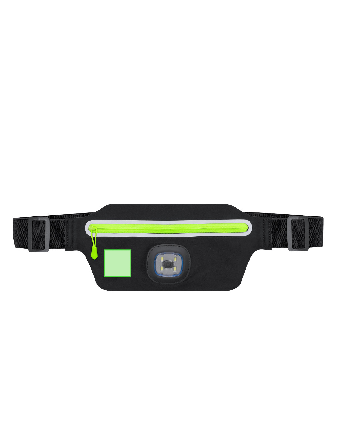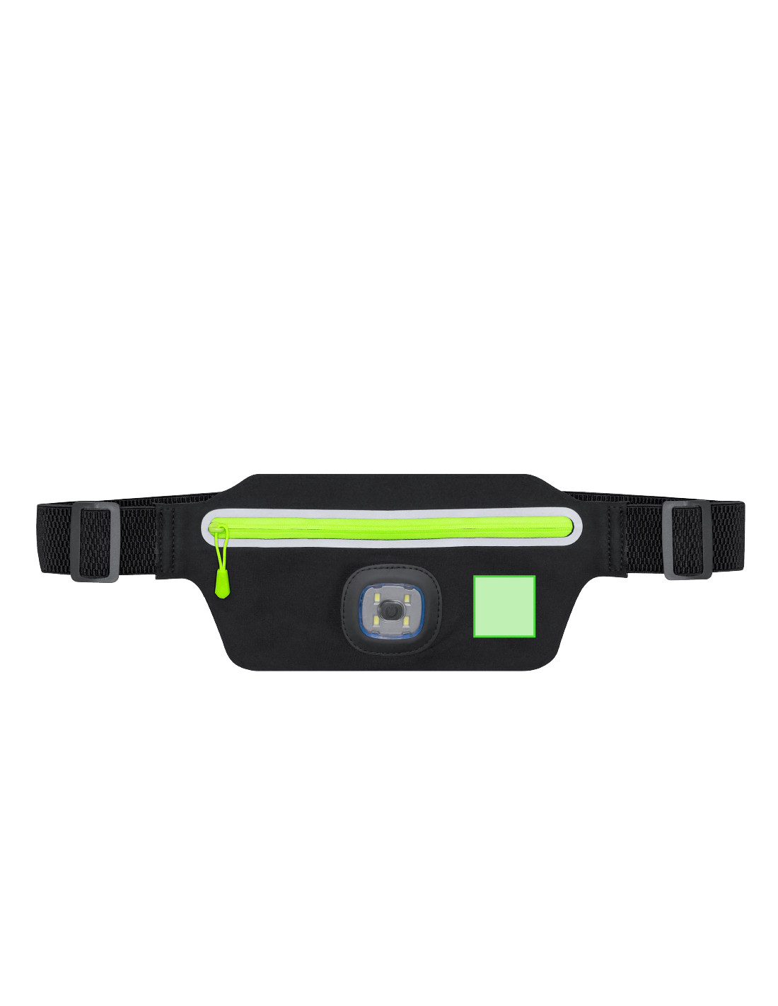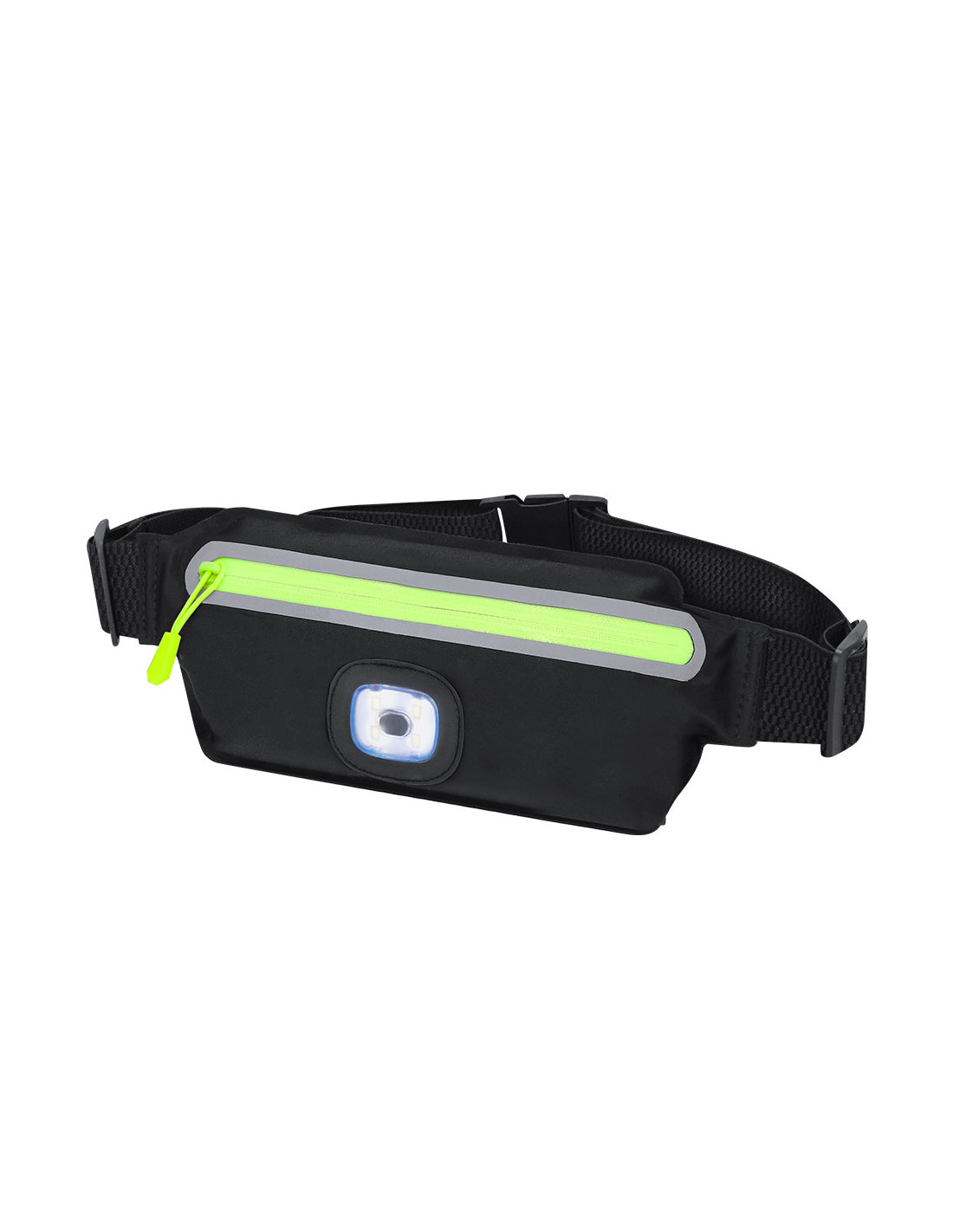 Riñonera fabricada en resistente poliéster. Compartimento principal con cierre de cremallera reflectante. En la parte frontal incluye una linterna con 3 intensidades de luz. Bateria de 300mAh, con carga a través de cable USB. Con cierre de hebilla y cinta ajustable, especialmente diseñada para actividades deportivas y de ocio.
