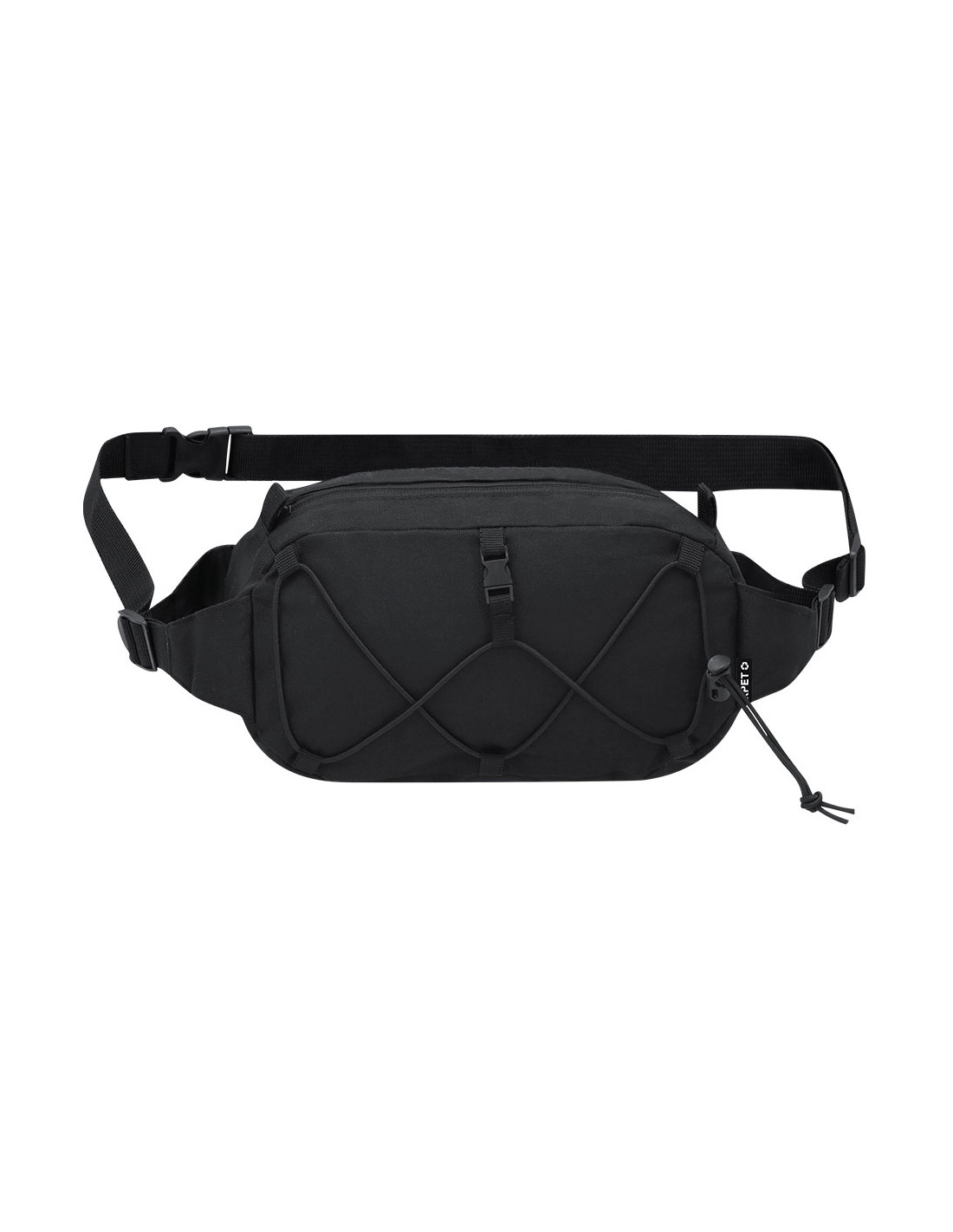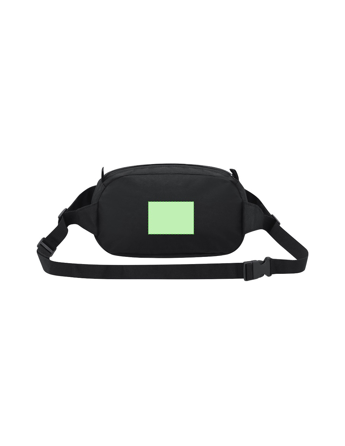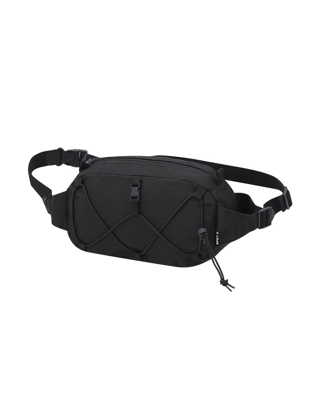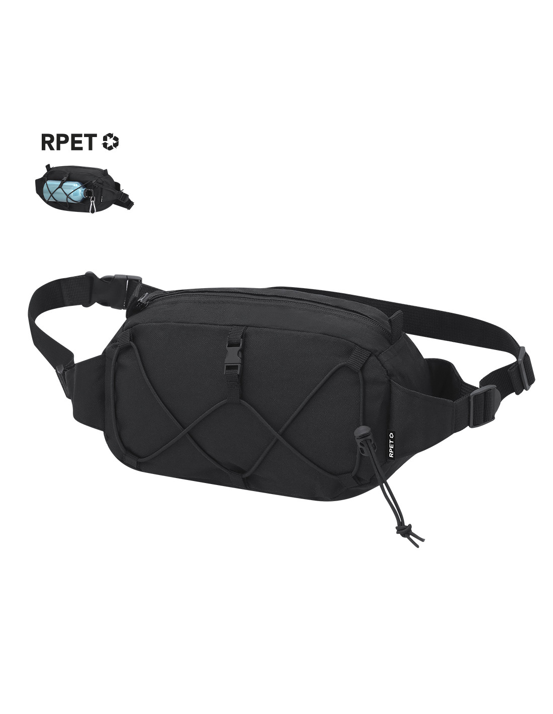 Riñonera fabricada en poliéster RPET 600D. Cuenta con un bolsillo principal con cierre de cremallera invisible en color negro, con tirador metálico en negro, y cinta ajustable con cierre de hebilla en la correa. En la parte frontal incluye un cordón elástico ajustable. Incluye etiqueta distintiva de RPET.