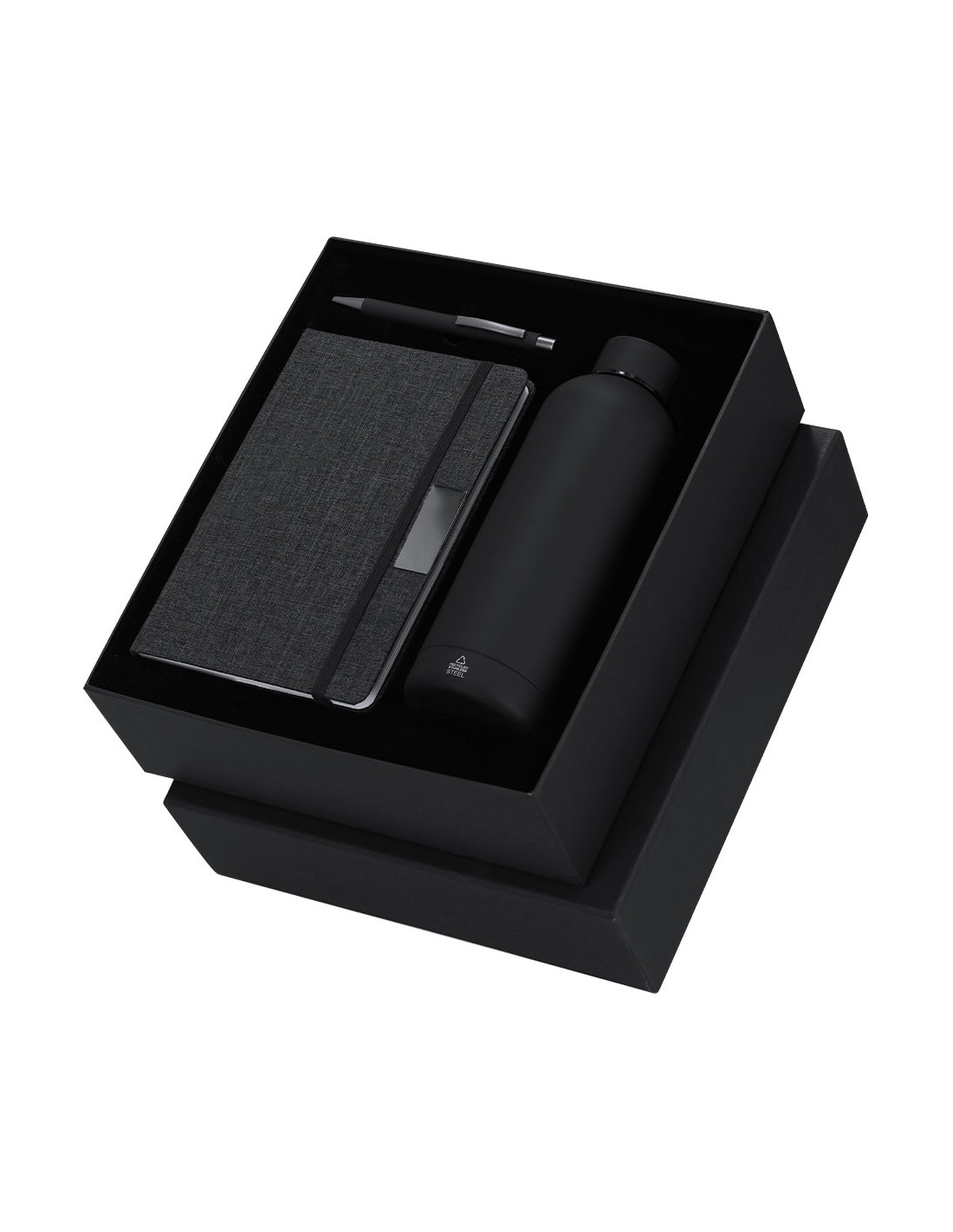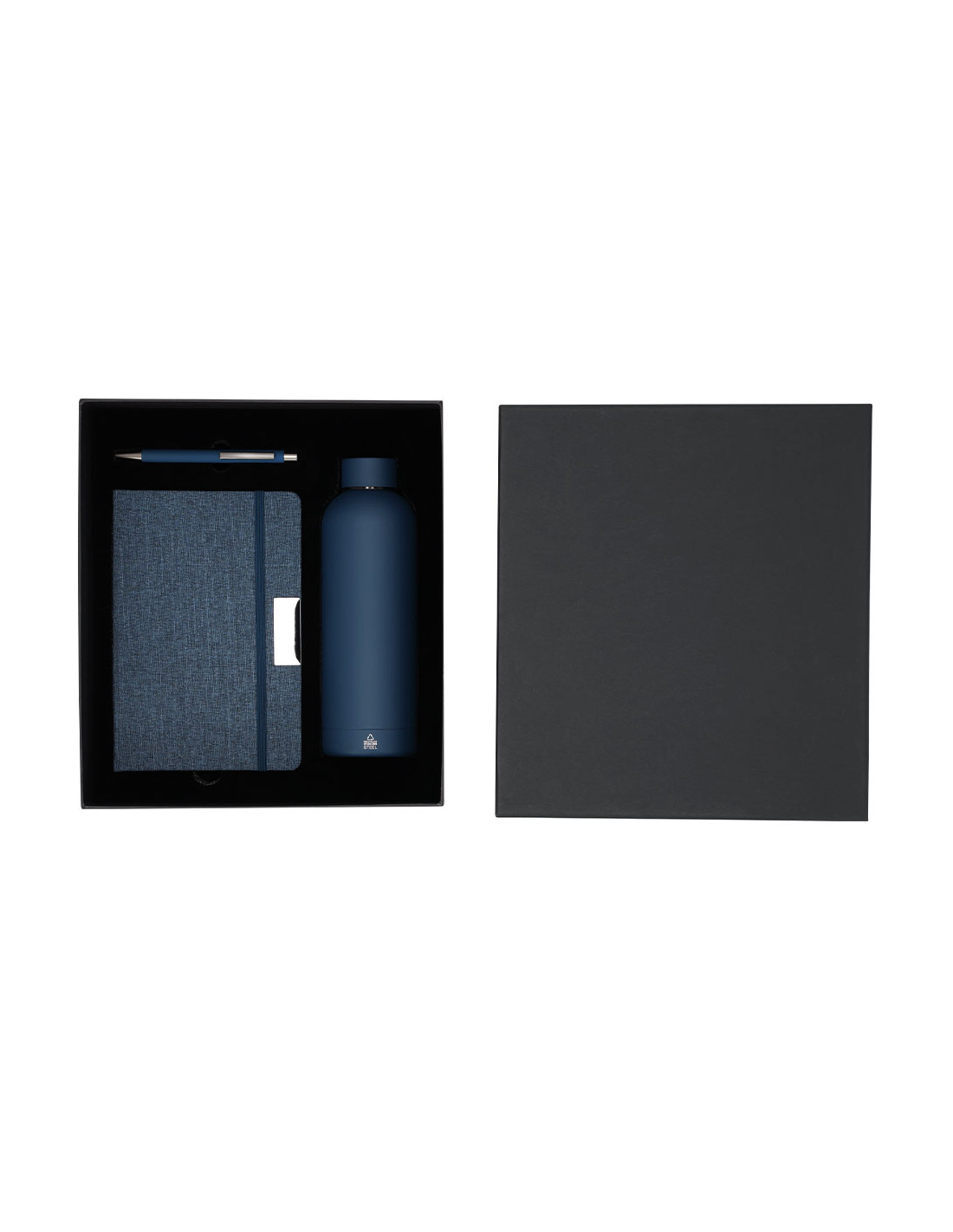 Set de bloc de notas y bolígrafo , además de un bidón térmico fabricado en acero inox.El set incluye:- Bloc de notas de tapas rígidas en RPET, con 80 páginas rayas, banda elástica con clip metálico y marcapáginas a juego.- Bolígrafo de aluminio reciclado en acabado gomoso, carga jumbo y tinta azul.- Bidón térmico de doble pared fabricado en acero inox de 500ml. Con tapón a rosca. Con distintivo logotipo Acero Inoxidable Reciclado.