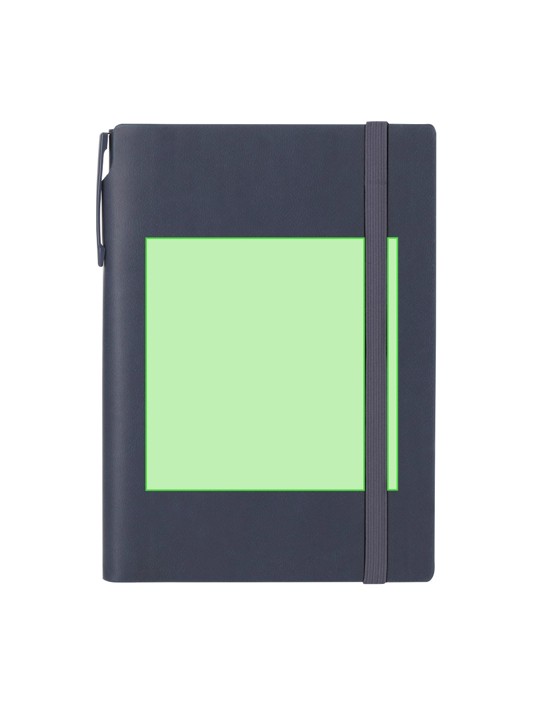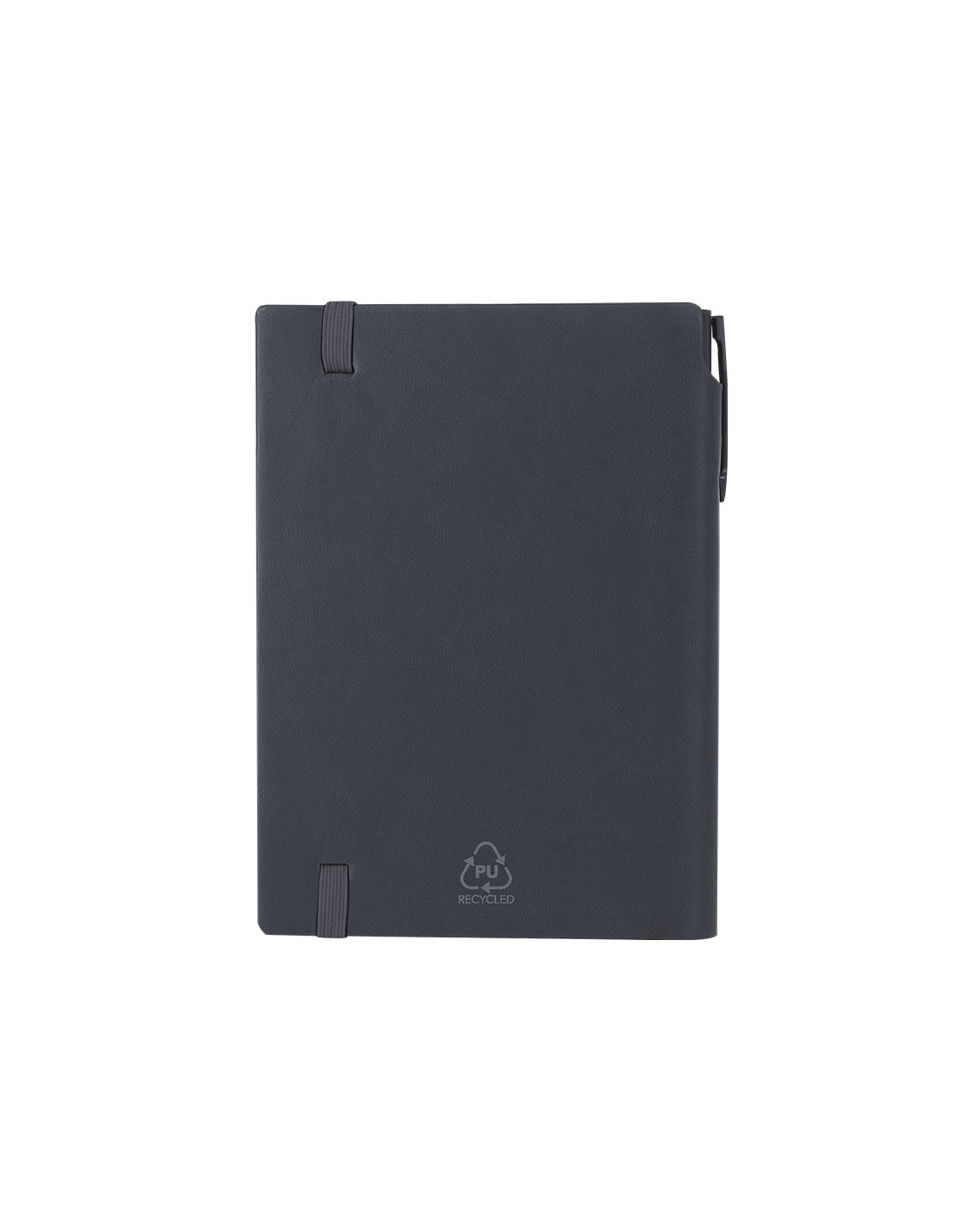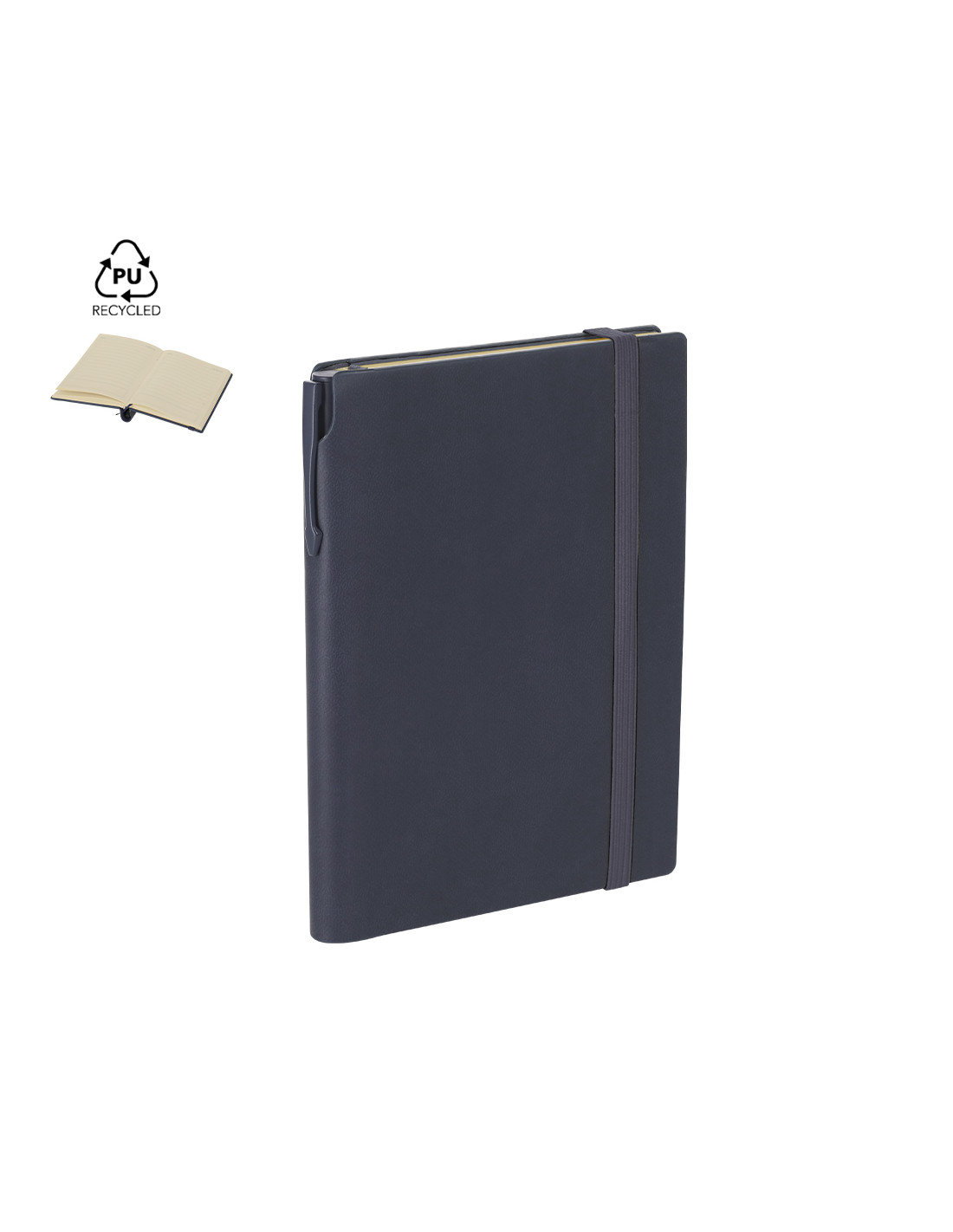 Set de bloc de notas y bolígrafo fabricados en PU reciclado y Aluminio Reciclado. El set incluye: - Bloc de notas fabricado en PU reciclada. Portadas rígidas, incluye 96 páginas de color crema, marcapáginas y cinta elástica de cierre a juego. Con distintivo logo PU reciclado. - Bolígrafo fabricado en Aluminio reciclado, con cuerpo en color sólido en acabado caucho. Dispone de clip, mecanismo pulsador y tinta azul. Incluye distintivo logo en Aluminio reciclado.El bloc dispone de un espacio para guardar el bolígrafo pudiendo llevarlo todo en un mismo sitio.