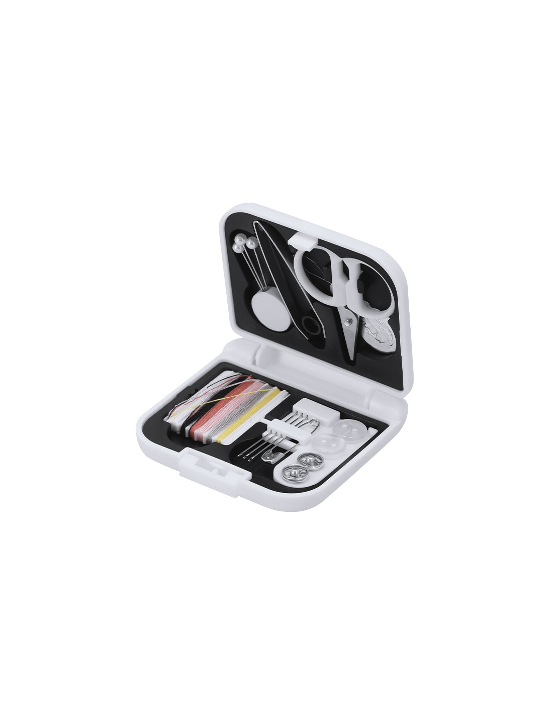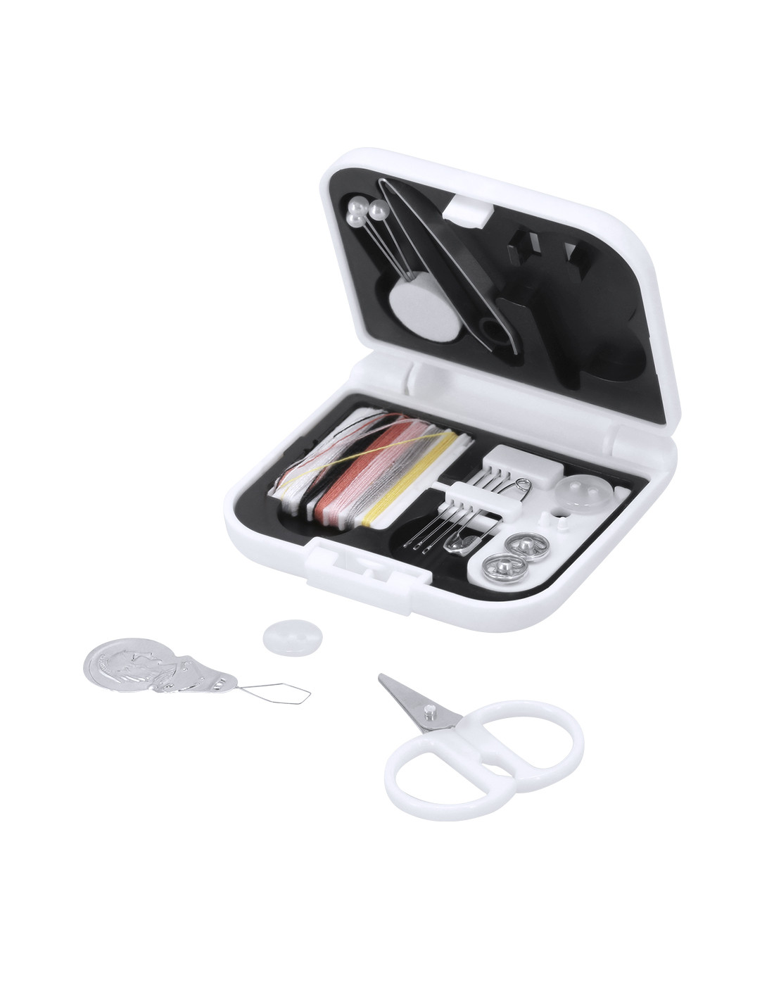 Set de costura presentado en un elegante estuche de color blanco fabricado en resistente PS.Incluye:- 1 tijera- 1 enhebrador- 1 pinza- 1 alfiletero- 3 alfileres con cabeza blanca brillante- 3 agujas- Hilos en 6 colores diferentes- 2 botones- 2 corchetes- 1 imperdibleIdeal para llevar en el bolso, la mochila o en tu maleta de viaje gracias a su tamaño compacto.