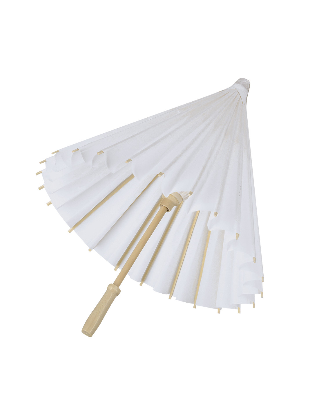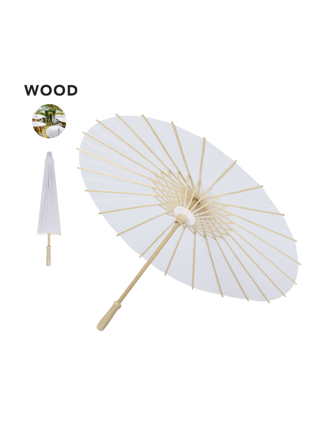 Original sombrilla de madera y tela en papel. Con mango en madera natural en acabado brillante. Sistema de apertura y cierre manual, con diámetro de 58 cm las varillas están fabricadas en madera. Ideal para eventos al aire libre.Elaborado con elementos vegetales para así fomentar la utilización de materias primas naturales y reducir las emisiones contaminantes.