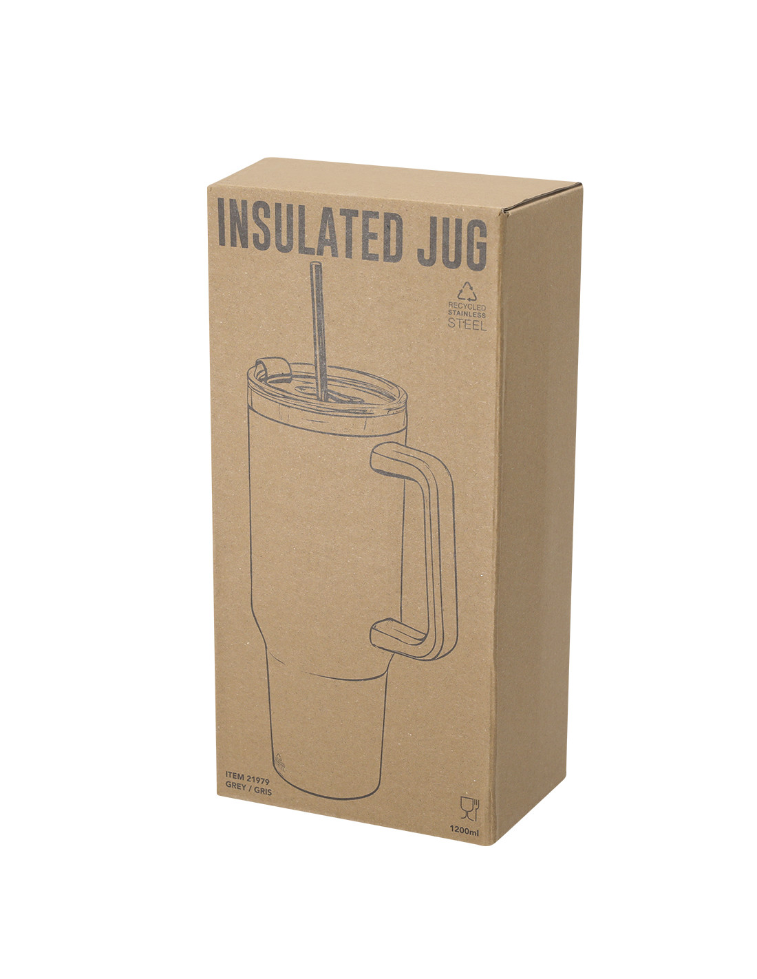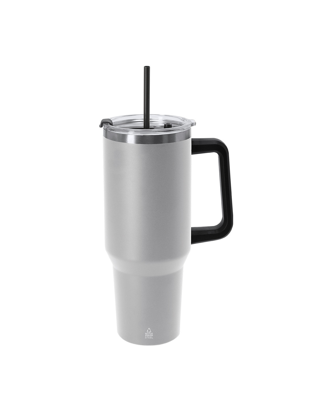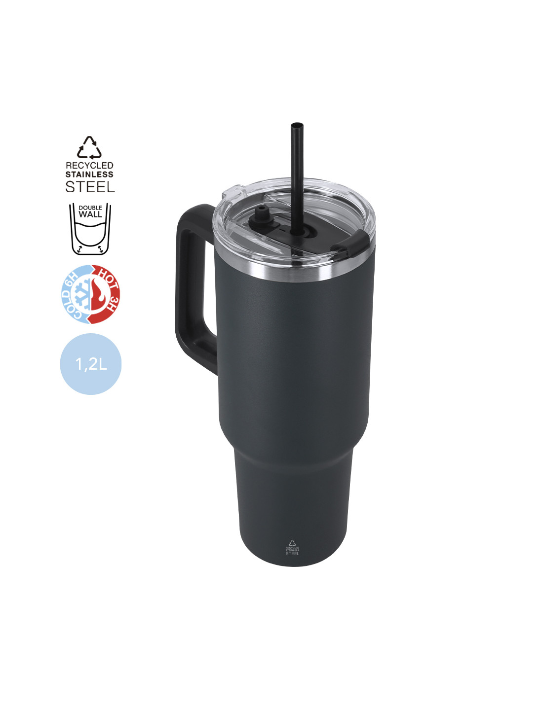 **Composición y materiales:** Jarra térmica de 1,2 L de capacidad. Fabricada en Acero Inoxidable Reciclado. Cuenta con doble sistema de bebida: orificio con cierre hermético y pajita integrada, adaptándose a las preferencias de uso. Incluye asa de transporte ergonómica de PP para mayor comodidad. Libre de BPA. Incluye distintivo acero inoxidable reciclado.