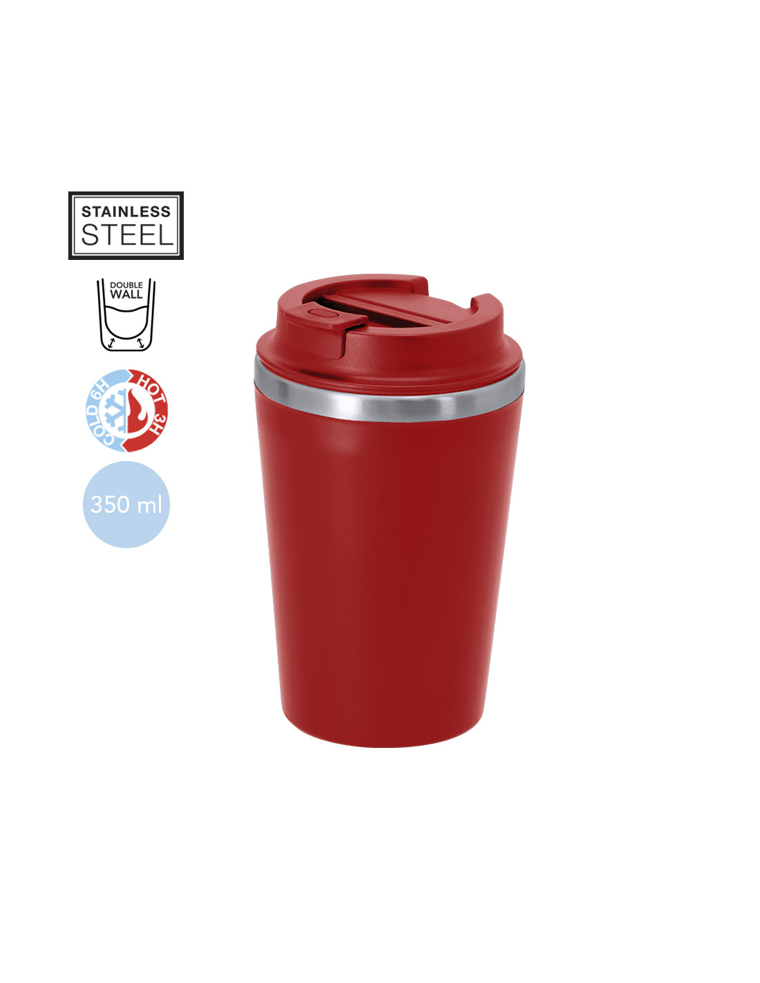Vaso térmico con capacidad de 350 ml, fabricado en Acero Inoxidable en interior y exterior de PP. Tiene doble pared para mantener la temperatura interior. Cuenta con tapadera de seguridad para un cierre hermético.