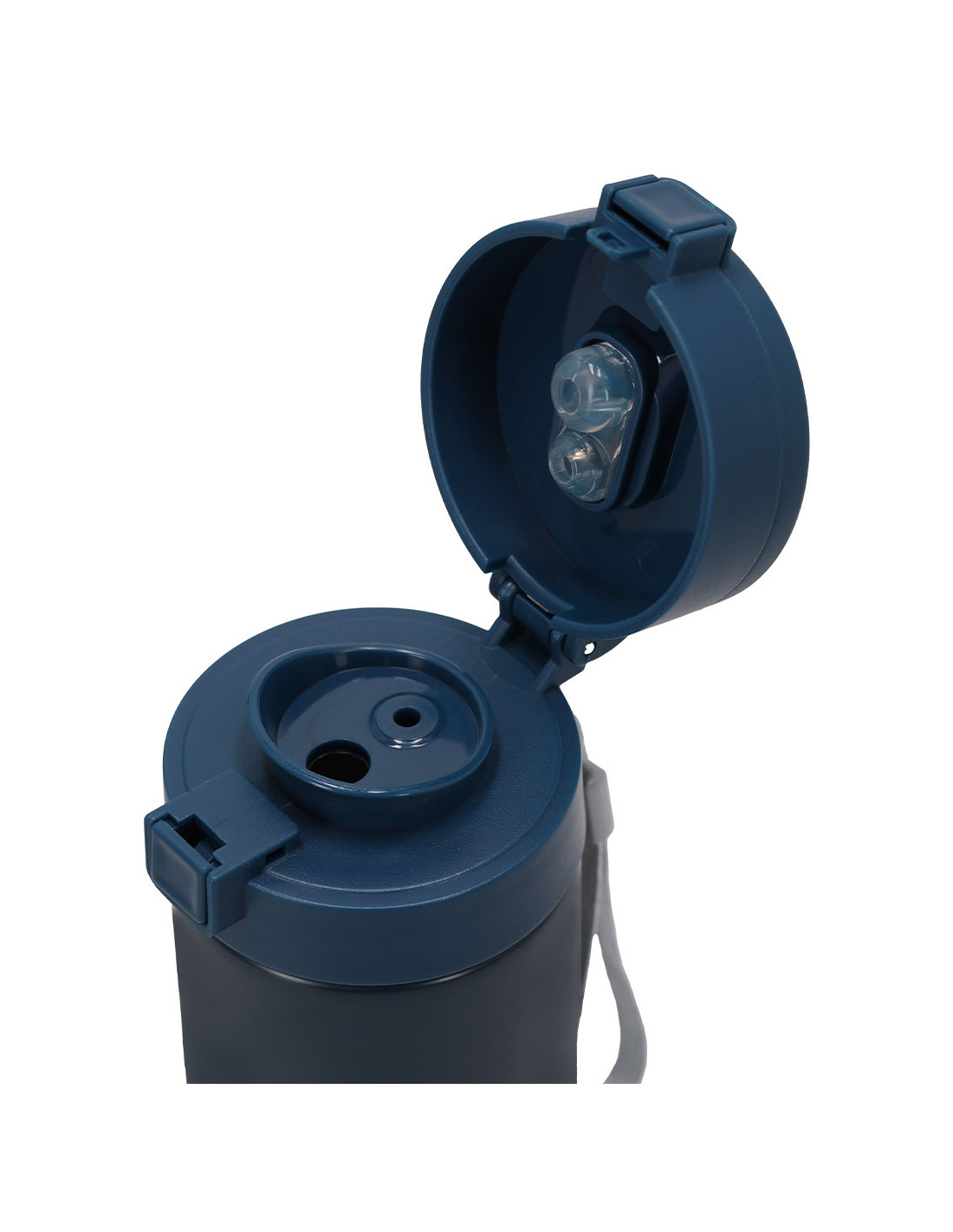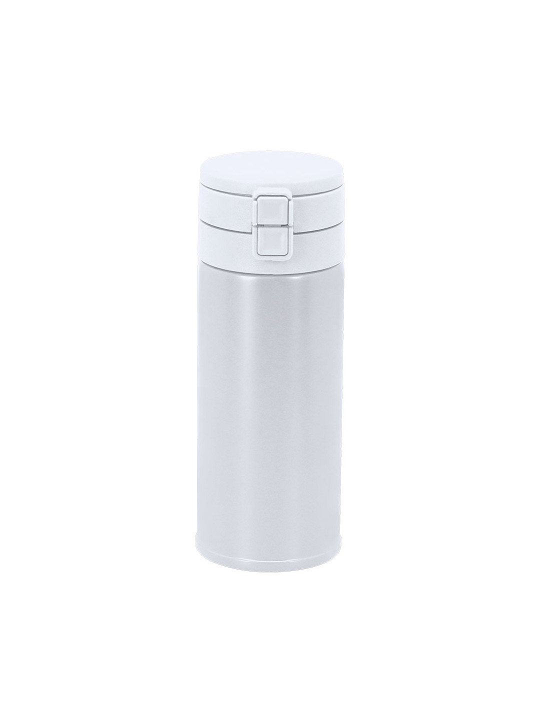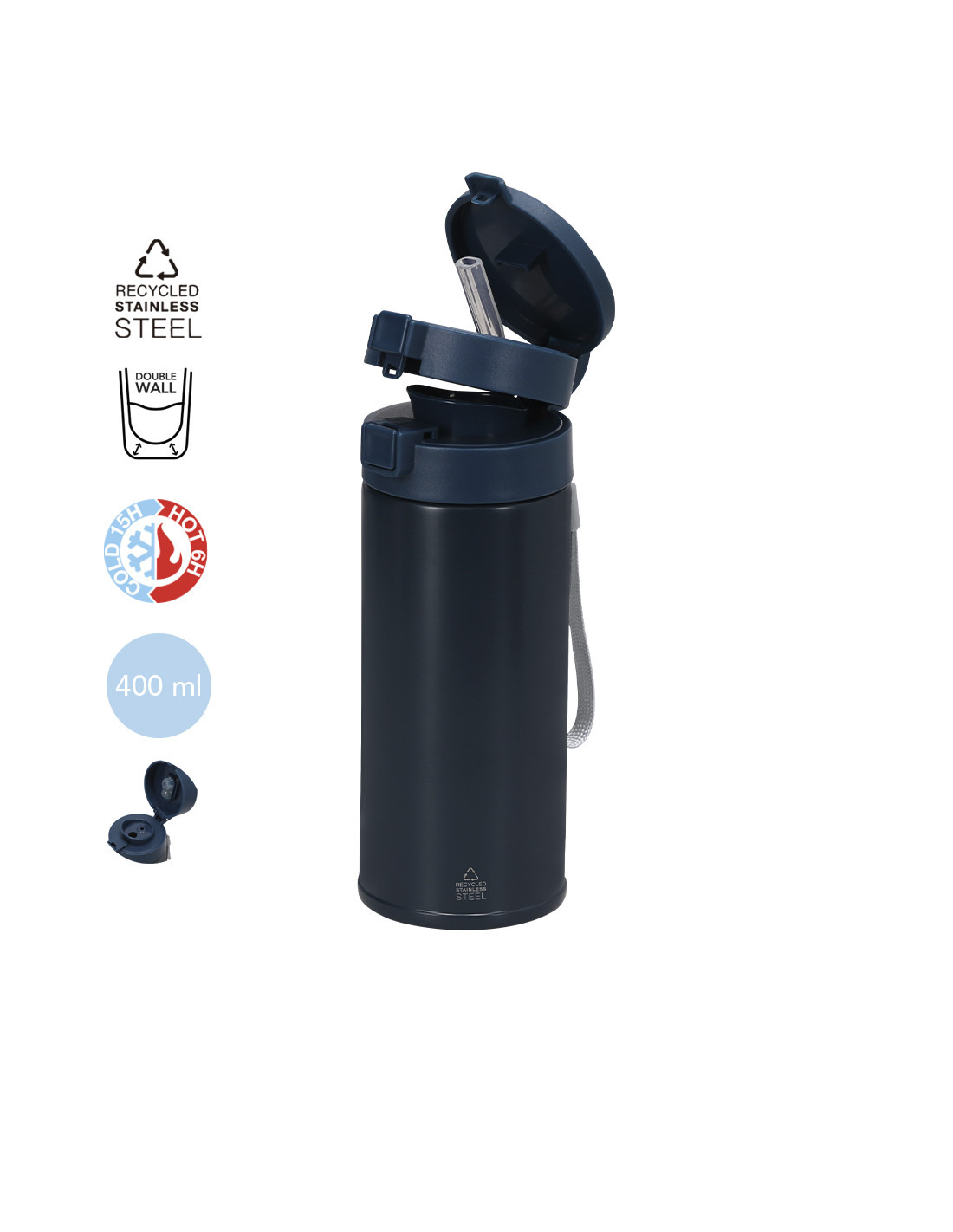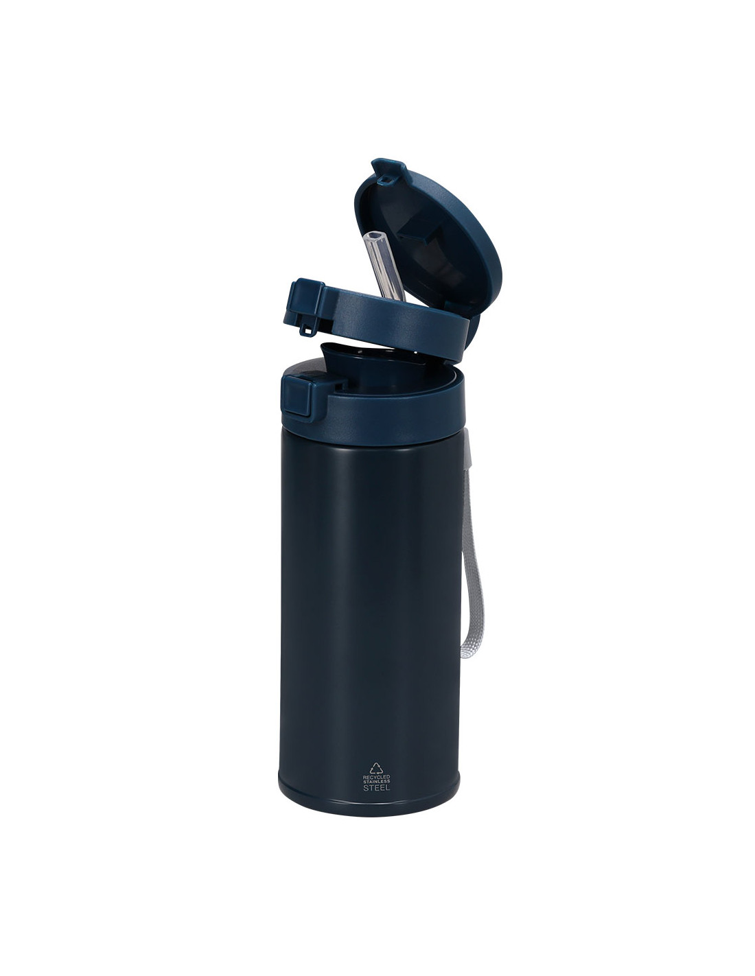 Vaso térmico de doble pared con 350 ml de capacidad. Fabricado en Acero Inoxidable Reciclado. Cuenta con doble sistema de bebida: orificio para beber directamente y, pajita integrada, adaptándose a las preferencias de uso. Con doble tapa de sistema de cierre de push. Libre de BPA. Con distintivo de Acero Inoxidable Reciclado.