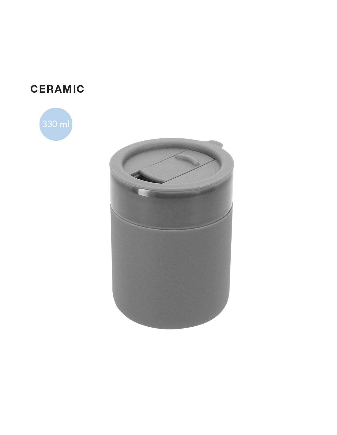 Vaso fabricado en cerámica. Con 330 ml de capacidad. Incluye funda de silicona en el mismo color para poder coger tu bebida sin quemarte gracias a su capacidad de aislamiento térmico. Incluye tapadera hermética equipada con un dosificador en la tapa del mismo color, diseñado para evitar fugas. Es ideal para tener en tu escritorio, mesa o en cualquier superficie donde disfrutar tranquilamente de tu bebida favorita.