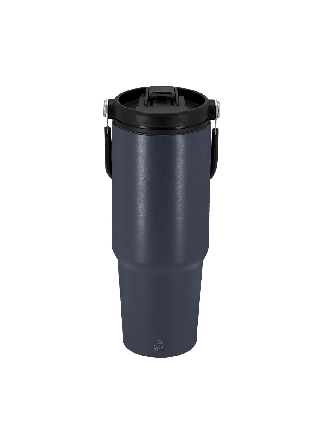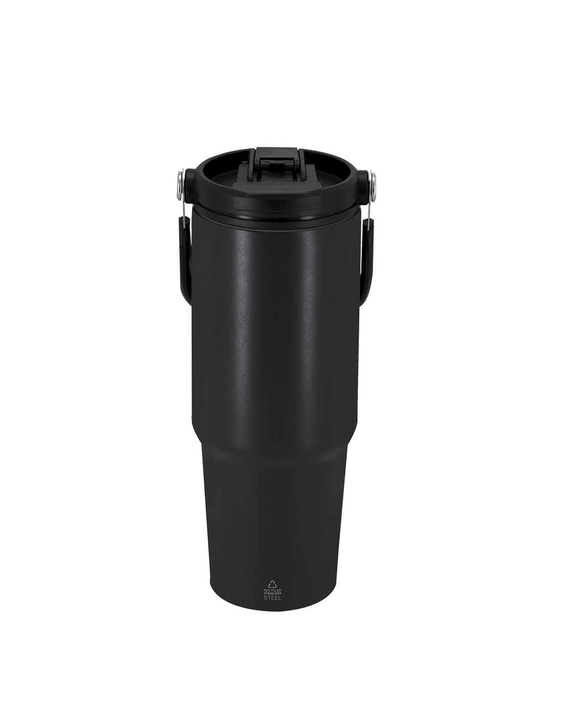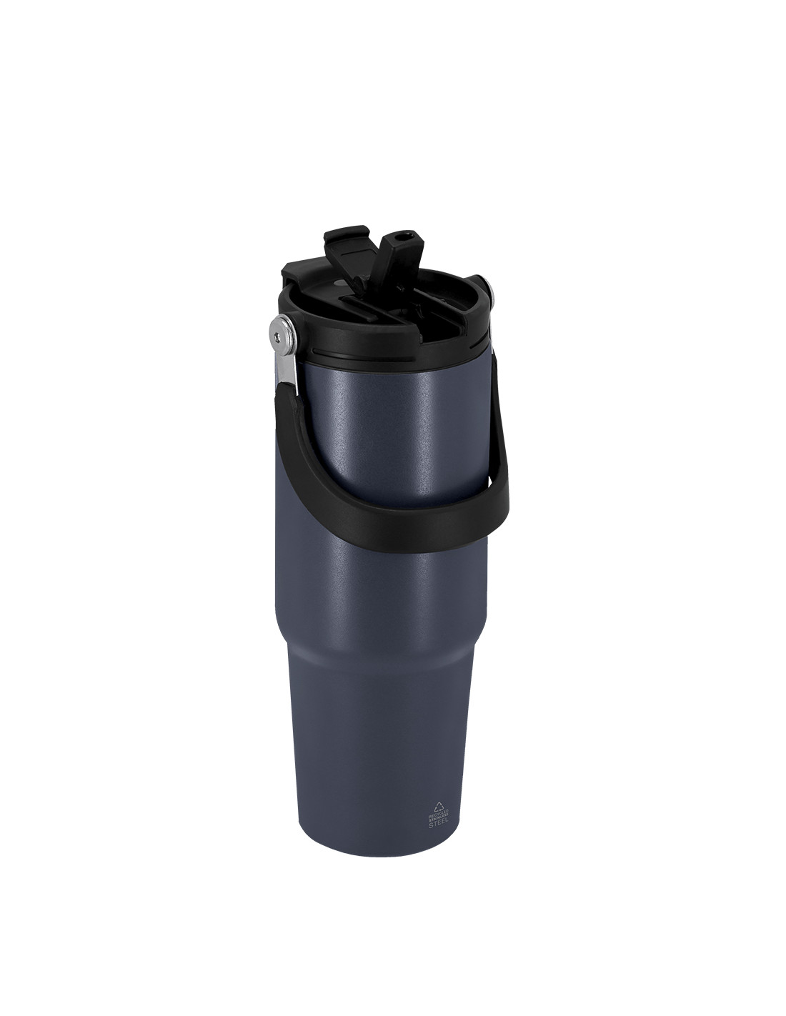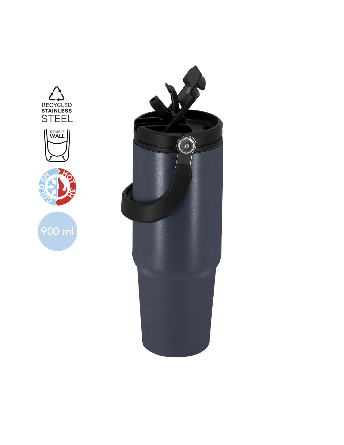**Composición y materiales:** Vaso térmico con 900 ml de capacidad. Fabricado en Acero Inoxidable Reciclado. Cuenta con doble sistema de bebida: orificio con cierre hermético y pajita integrada, adaptándose a las preferencias de uso. Con tapa de sistema de sellado hermético. Incluye práctica asa de transporte, ideal para transportarlo fácilmente en cualquier situación. Libre de BPA. Con distintivo de Acero Inoxidable Reciclado.
