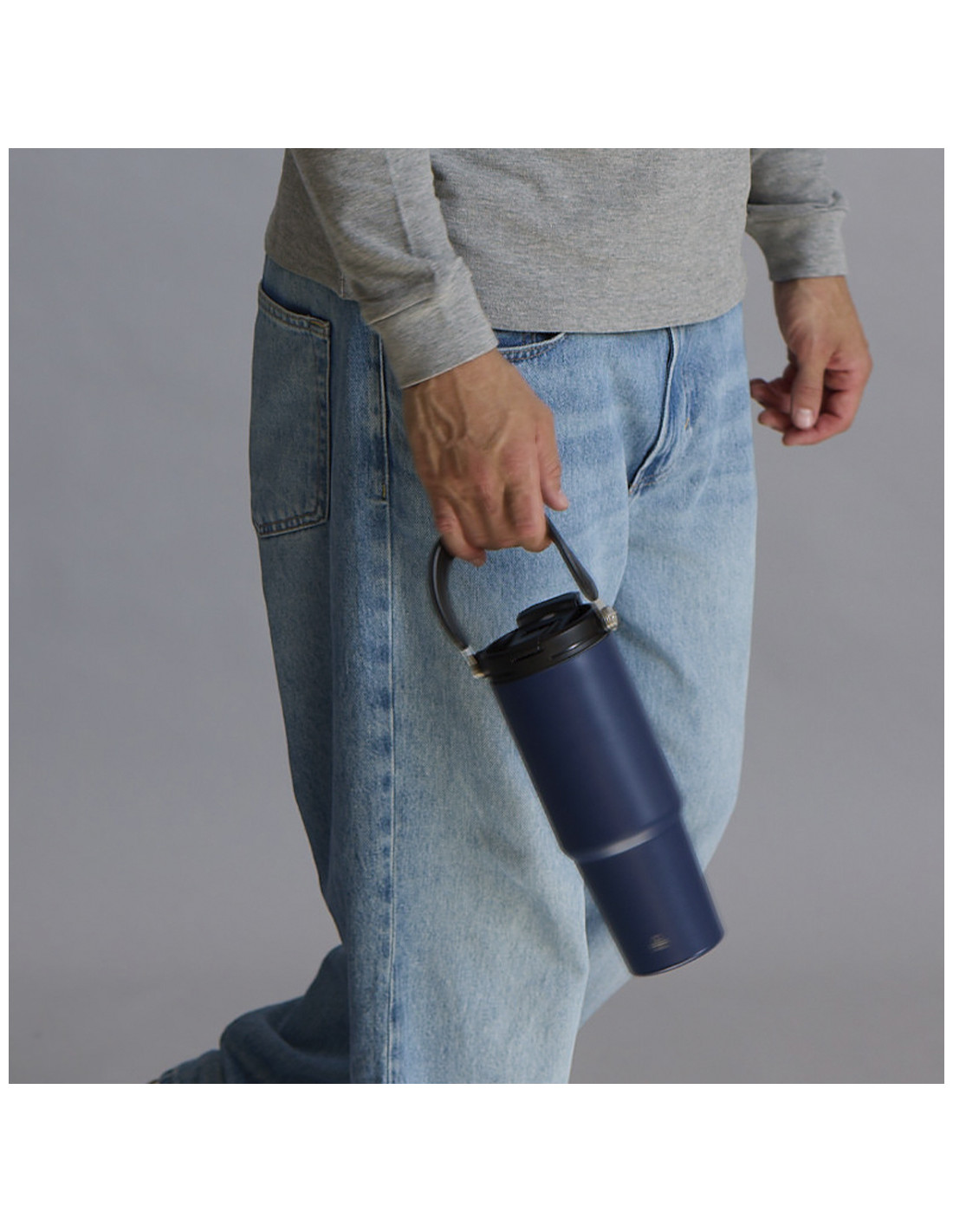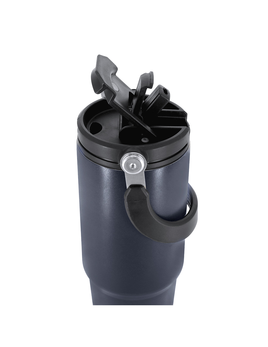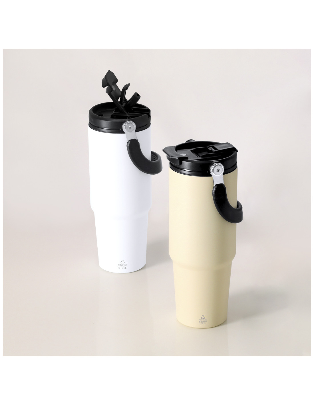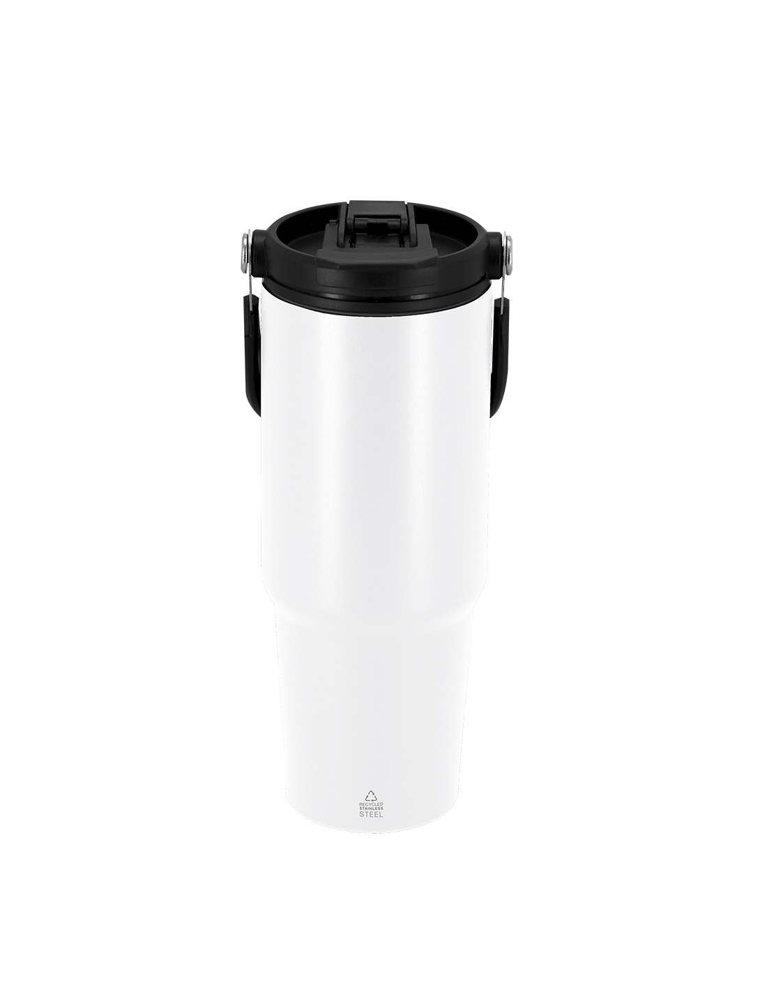 **Composición y materiales:** Vaso térmico con 900 ml de capacidad. Fabricado en Acero Inoxidable Reciclado. Cuenta con doble sistema de bebida: orificio con cierre hermético y pajita integrada, adaptándose a las preferencias de uso. Con tapa de sistema de sellado hermético. Incluye práctica asa de transporte, ideal para transportarlo fácilmente en cualquier situación. Libre de BPA. Con distintivo de Acero Inoxidable Reciclado.