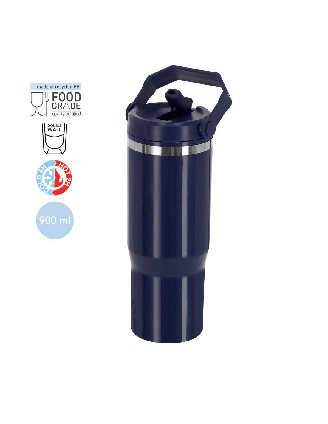 Vaso térmico con 900 ml de capacidad con doble pared. Fabricado en PP . Cuenta con pajita integrada. Con tapa de sistema de sellado hermético. Incluye práctica asa de transporte, ideal para transportarlo fácilmente en cualquier situación. Libre de BPA. Con certificación Food Grade, garantizando la seguridad cuando los alimentos entran en contacto con el material usado para fabricar el producto.